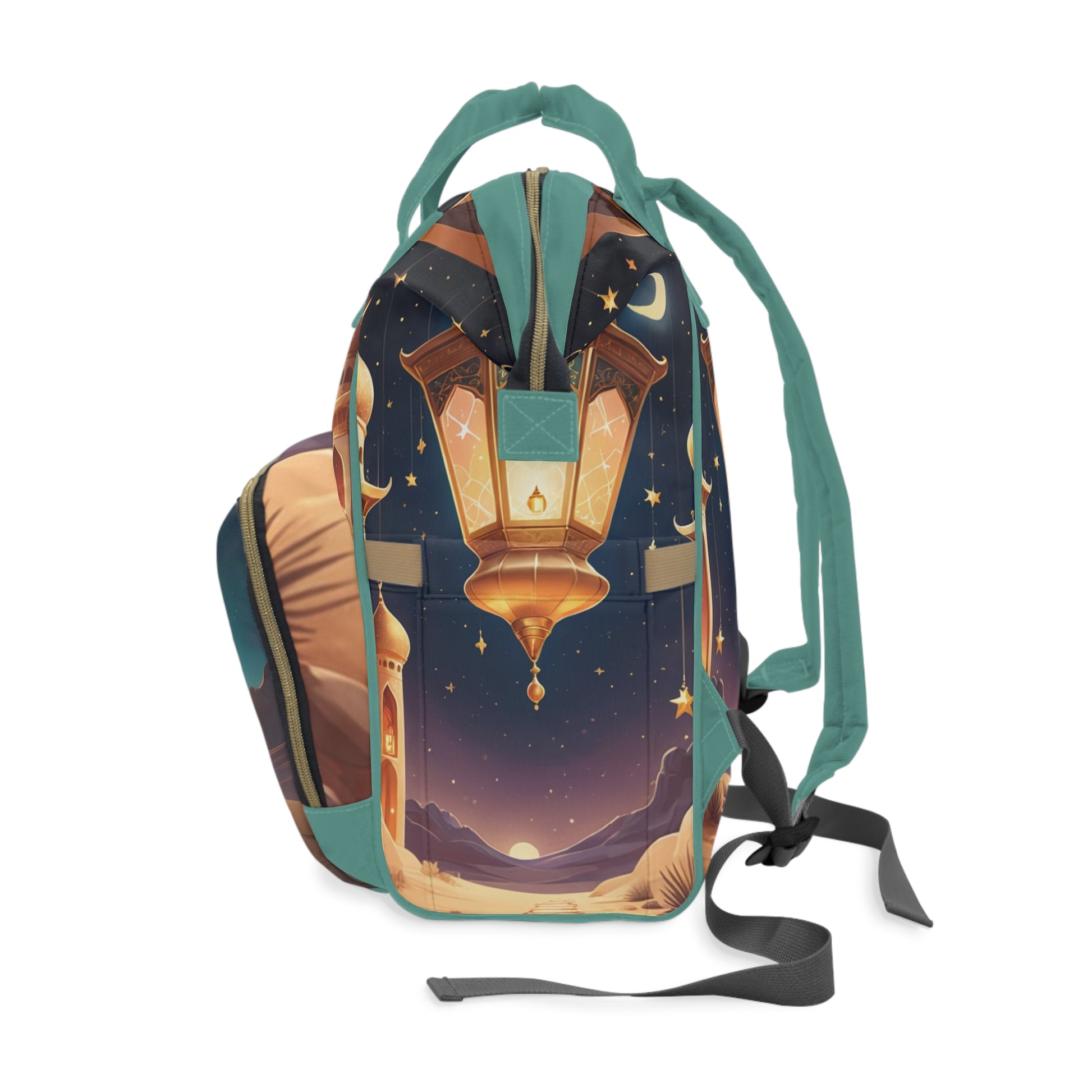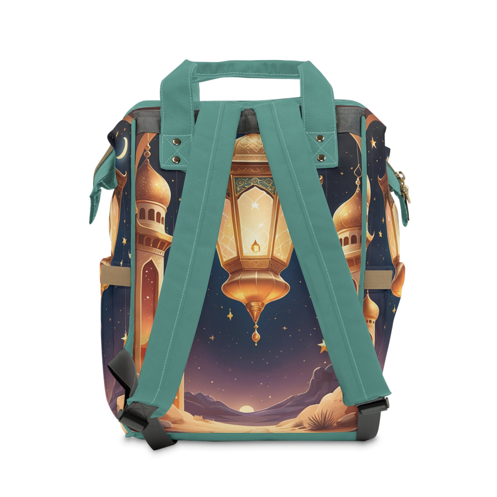 The Ali Arabic Baby Bag glows with the charm of Arabian nights — golden lanterns shining under a star-filled sky, soft desert dunes, and the peaceful presence of baby Ali wrapped in turquoise and gold.