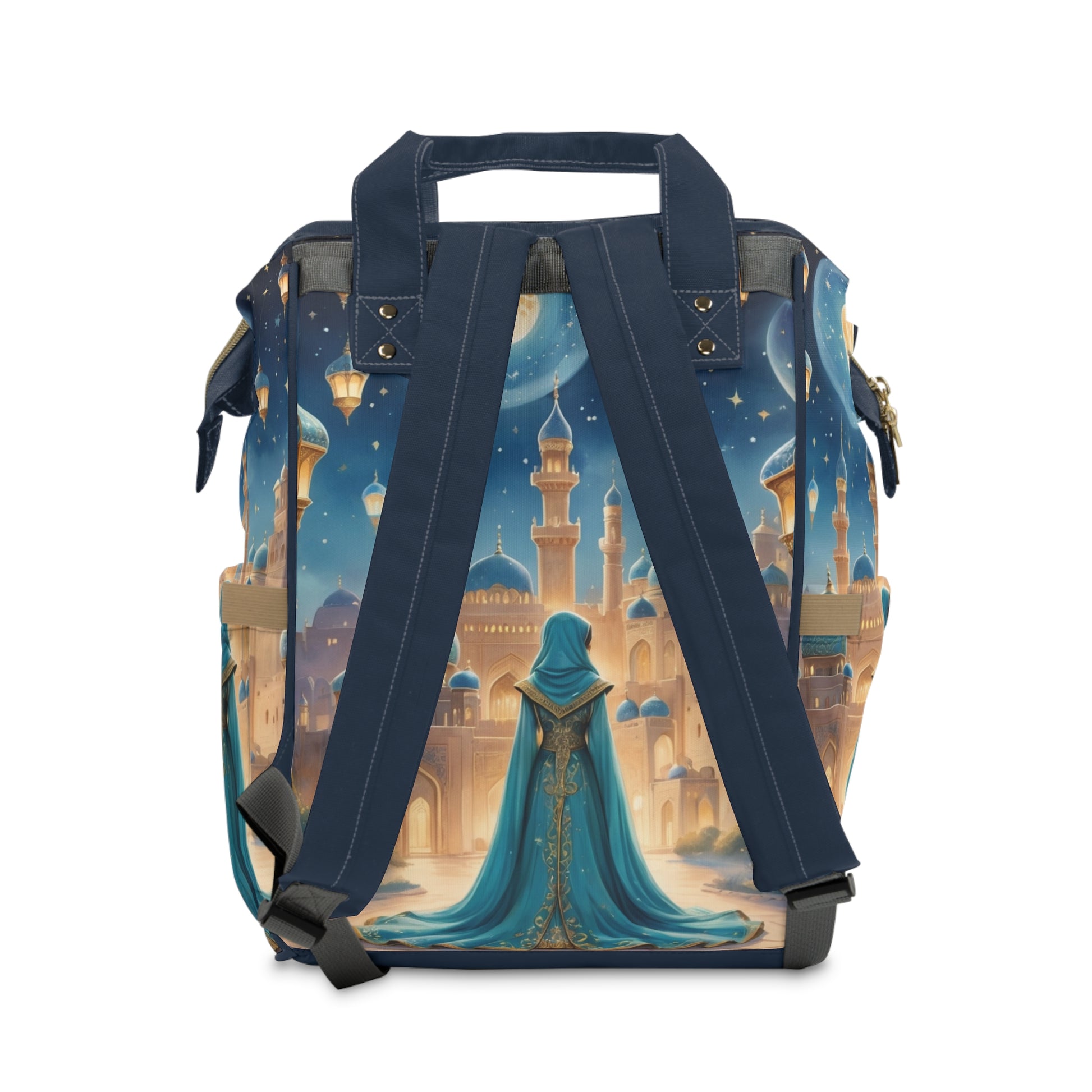 The Amir Arabic Baby Bag captures the timeless magic of Arabian nights — where golden lanterns shine, stars dance, and the crescent moon watches over every dream. In this enchanting scene, baby Amir sits peacefully under a glowing sky, surrounded by the beauty of domes and towers that evoke tales of wonder and love.