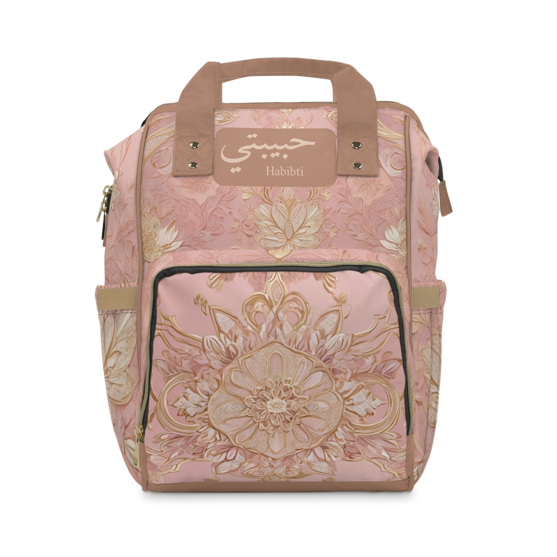 This elegant blush pink diaper backpack is adorned with delicate gold floral accents, creating a timeless and luxurious design. The Arabic word Habibti (حبيبتي), meaning My Darling, is beautifully displayed, making this bag more than just practical — it’s a statement of love and cultural pride.