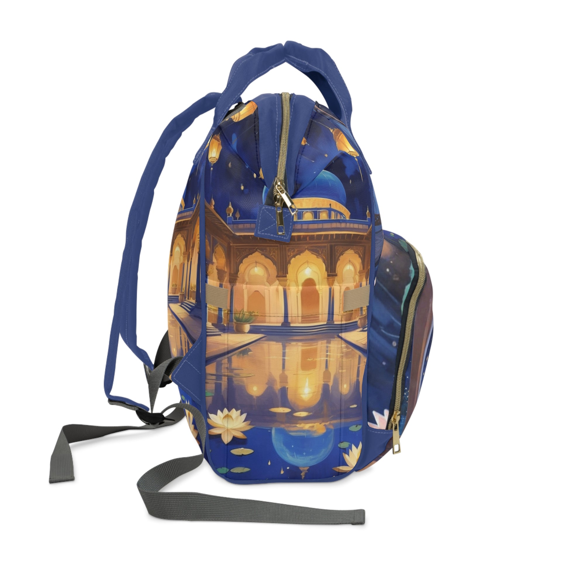 The Arjun Baby Bag (अर्जुन) celebrates India’s regal beauty and the warmth of its traditions. This elegant design portrays Arjun, a sweet baby boy in royal blue and gold attire, sitting peacefully by a glowing lantern pool. Surrounded by floating lotus blossoms, golden arches, and twinkling lights, the design captures the serenity and magic of Indian heritage.