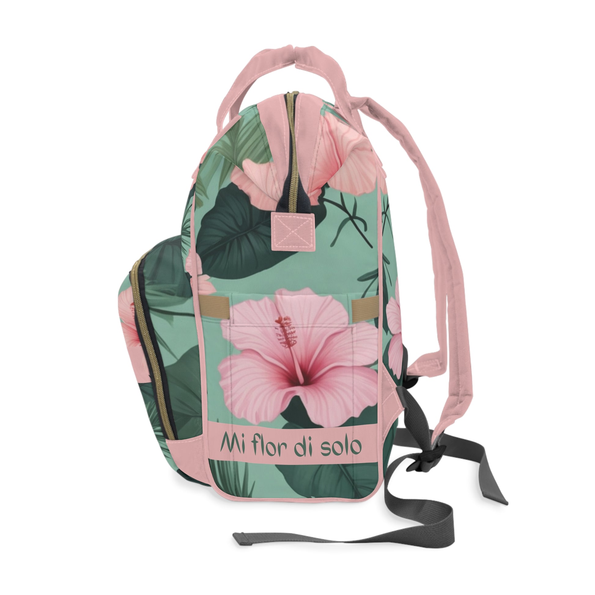 This tropical-inspired backpack features delicate pink hibiscus flowers with lush green leaves, bringing a fresh and cheerful vibe to your everyday baby essentials. Designed for stylish parents, this waterproof diaper bag is both practical and eye-catching — perfect for family trips, strolls, and vacations.