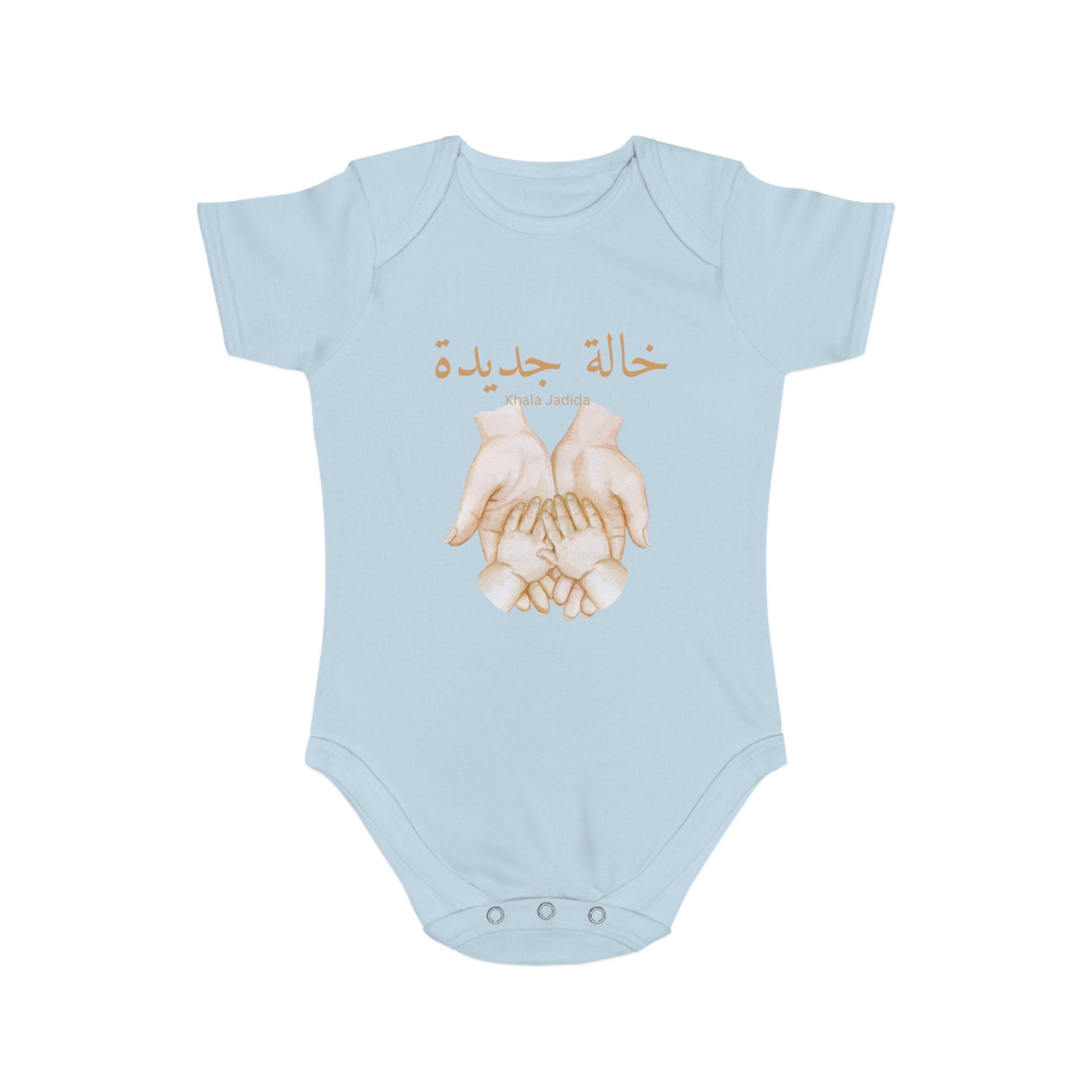 This baby bodysuit is a beautiful way to surprise an aunt to be. Featuring the Arabic phrase Khala Jadida which means New Aunt this soft cotton romper makes a cultural and meaningful keepsake. The tender design with children’s hands in adult hands symbolizes family love making it perfect for pregnancy reveals baby showers and family surprises.