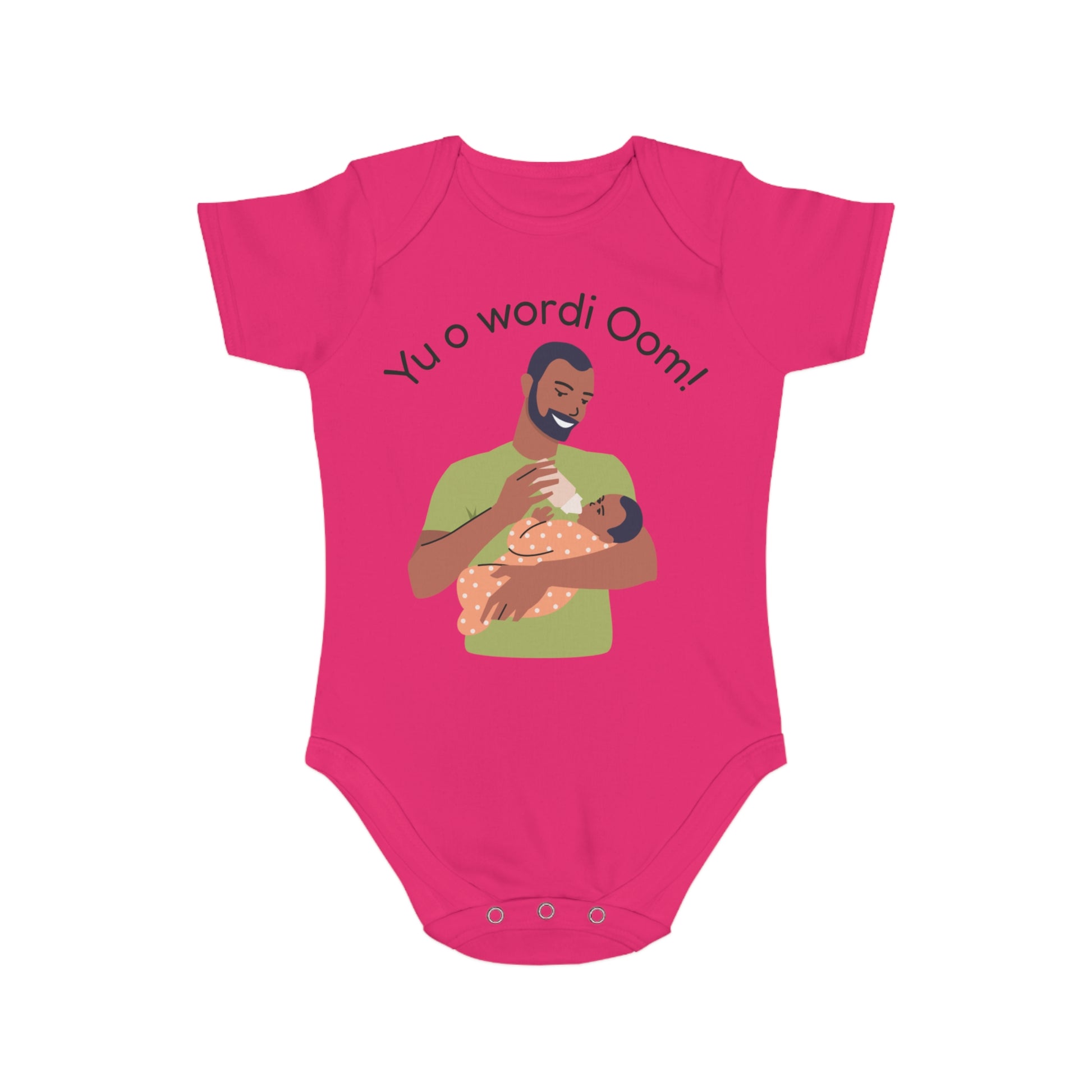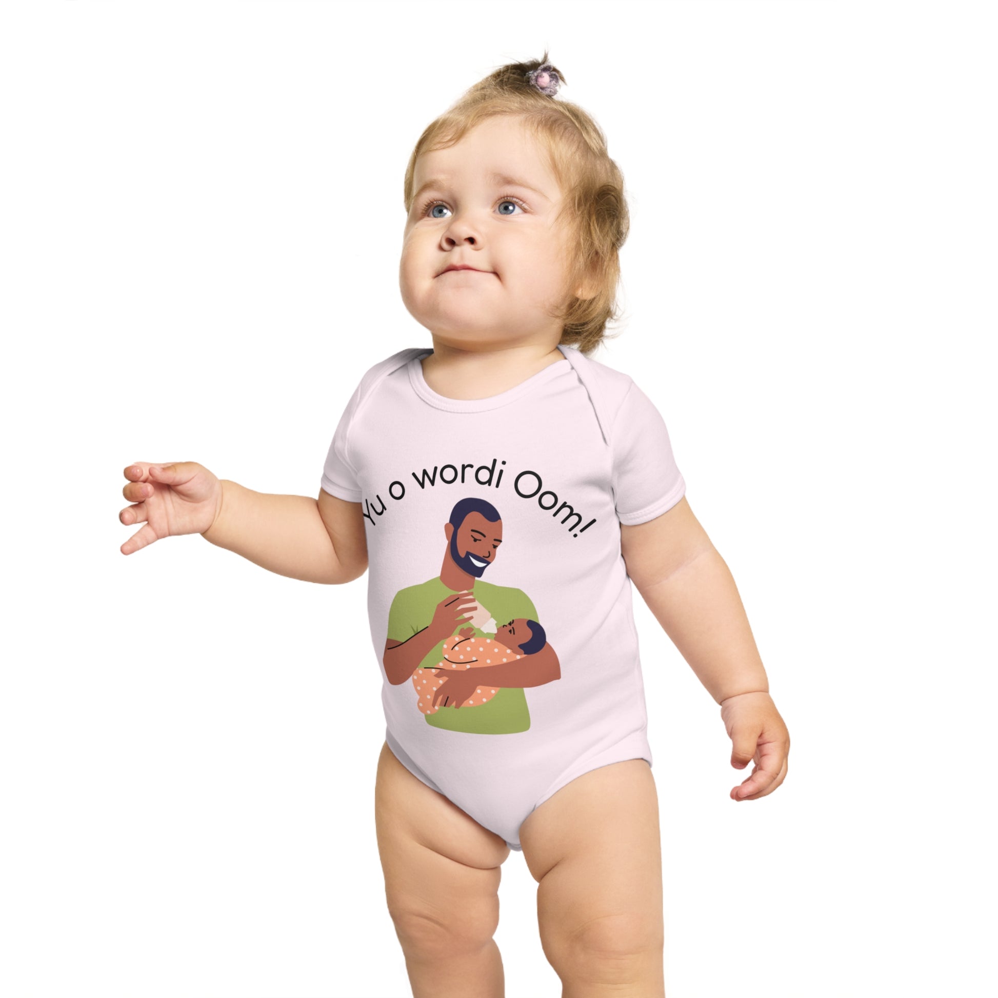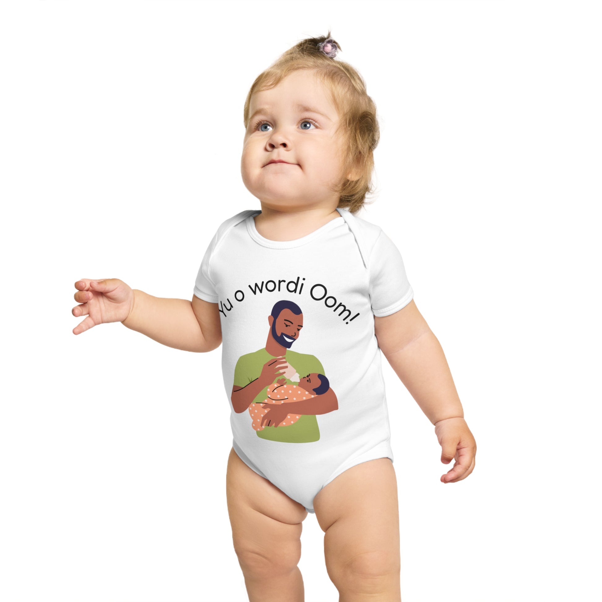 Celebrate family with this unique baby announcement bodysuit featuring the Surinamese phrase “Yu o wordi Oom,” which means “You will become an uncle.” A heartwarming way to reveal your pregnancy news, this soft cotton romper makes the perfect gift for proud new uncles. The loving design shows a caring uncle feeding a baby, making it an unforgettable keepsake for baby showers, pregnancy reveals, and special family moments.
