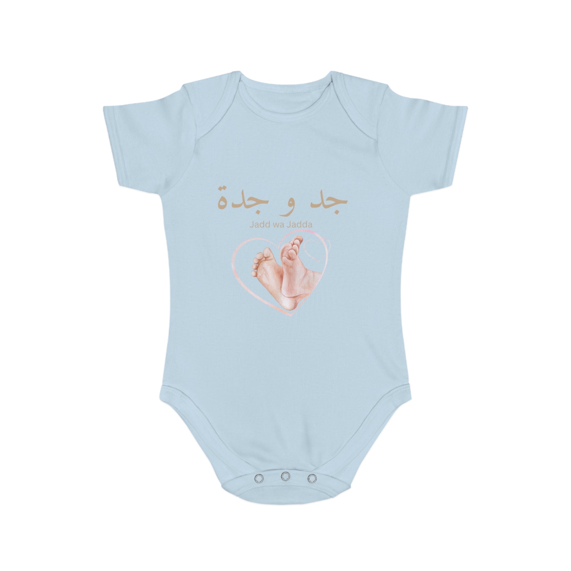 This baby bodysuit is a heartfelt way to announce the arrival of a new grandchild. Featuring the Arabic phrase Jadd wa Jadda which means Grandparents this soft cotton romper is a cultural and unique keepsake. The sweet design with baby feet inside a heart adds charm making it perfect for pregnancy reveals baby showers and family surprises.