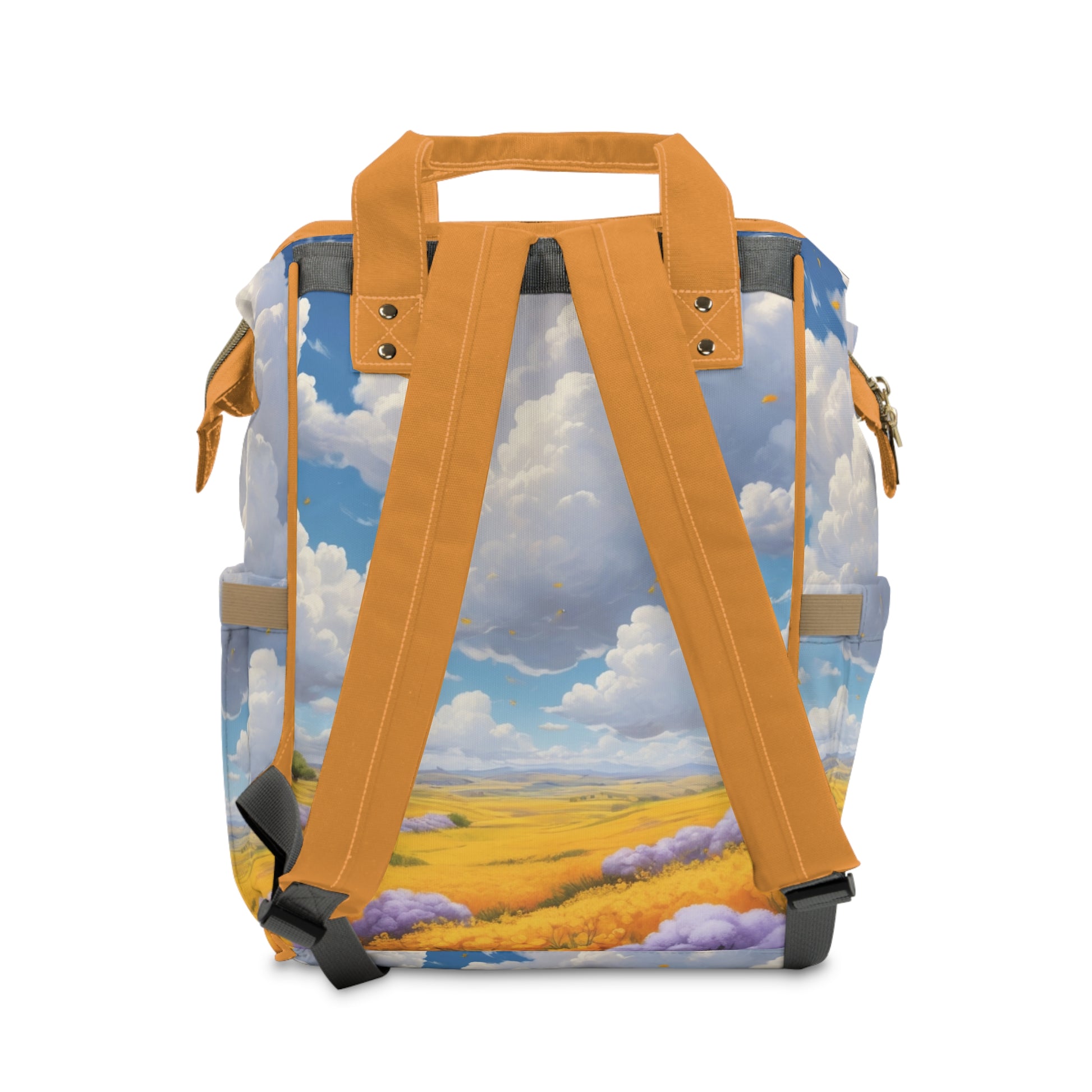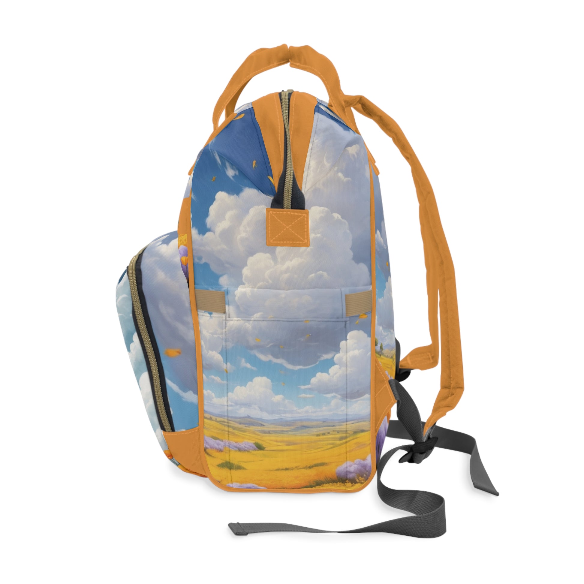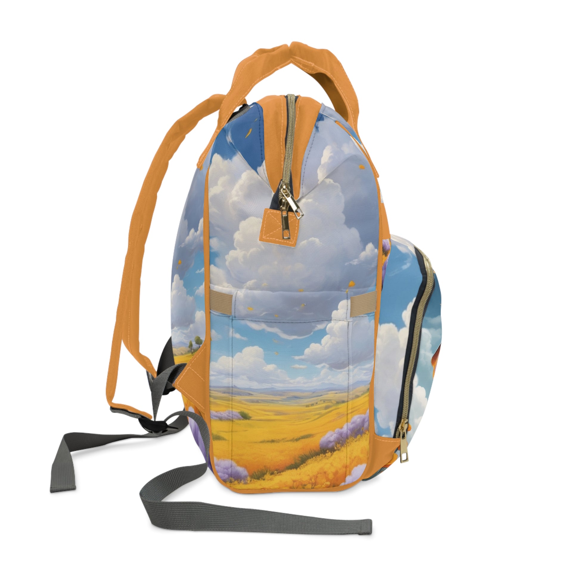 Color: Sky blue, orange, and gold tones