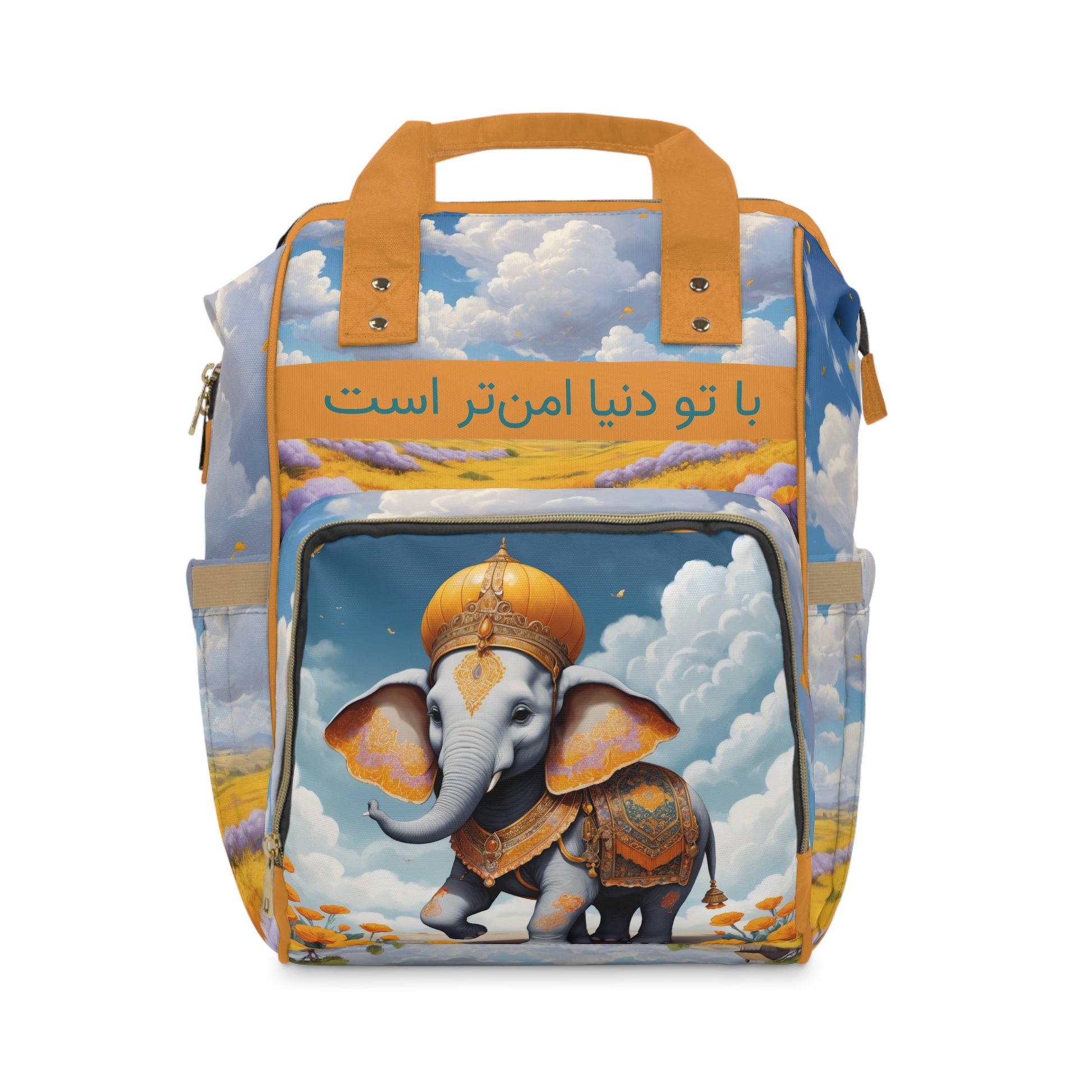This enchanting design features a majestic baby elephant wearing a golden crown and adorned with intricate Persian-inspired patterns. Set against dreamy clouds and warm flower fields, the artwork radiates strength and tenderness. The Farsi inscription translates to “With you, the world is safer”, a heartfelt expression of love and security. Spacious, waterproof, and durable — this diaper backpack blends cultural elegance with everyday practicality, making it a meaningful and unique baby shower gift.