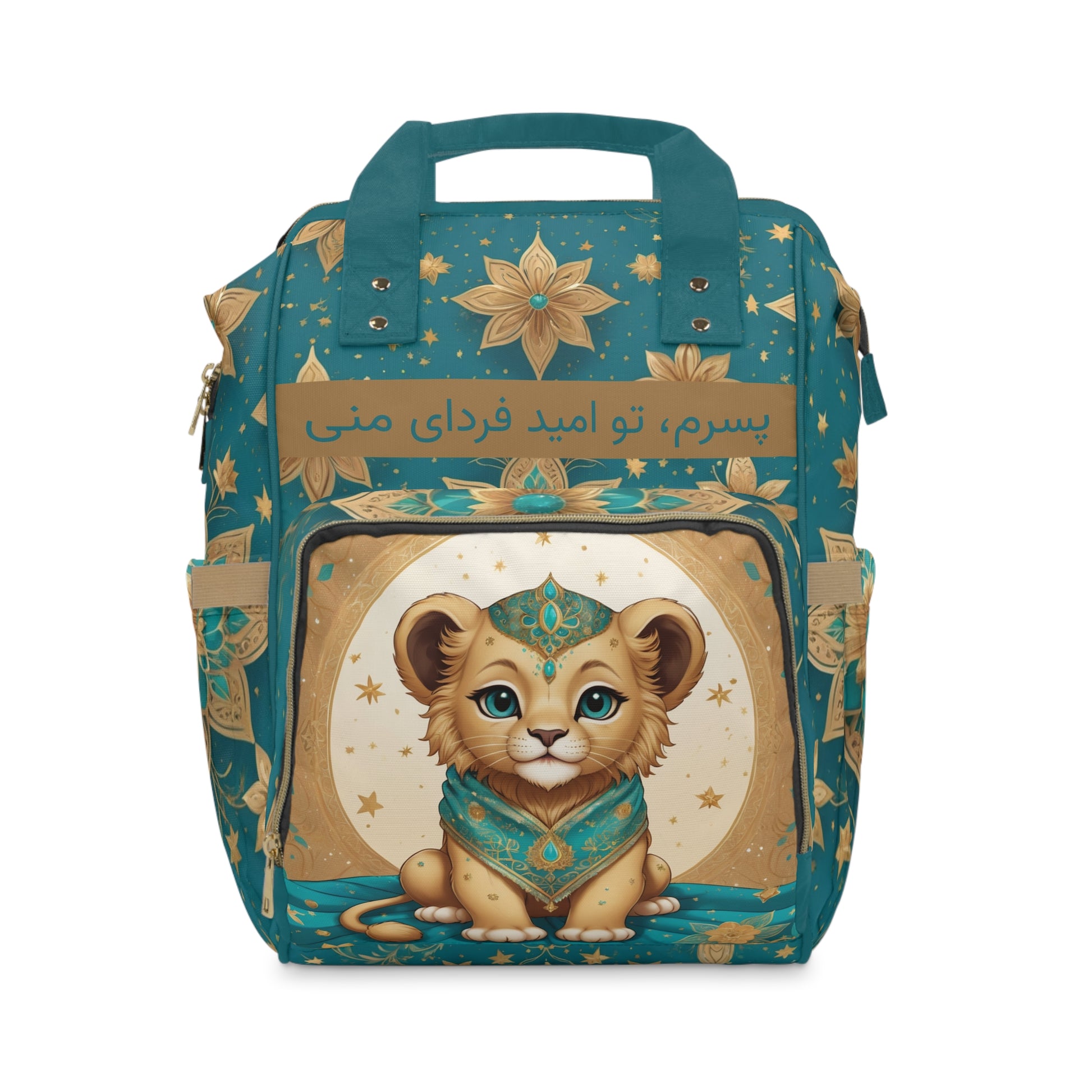 This enchanting design features a cute lion cub adorned with Persian-inspired turquoise and gold patterns, seated against a starry ornamental background. The Farsi inscription translates to “My son, you are my hope for tomorrow”, a heartfelt expression of love and pride. Spacious, waterproof, and durable — this diaper backpack blends cultural heritage with daily practicality, making it a meaningful and unique baby shower gift.