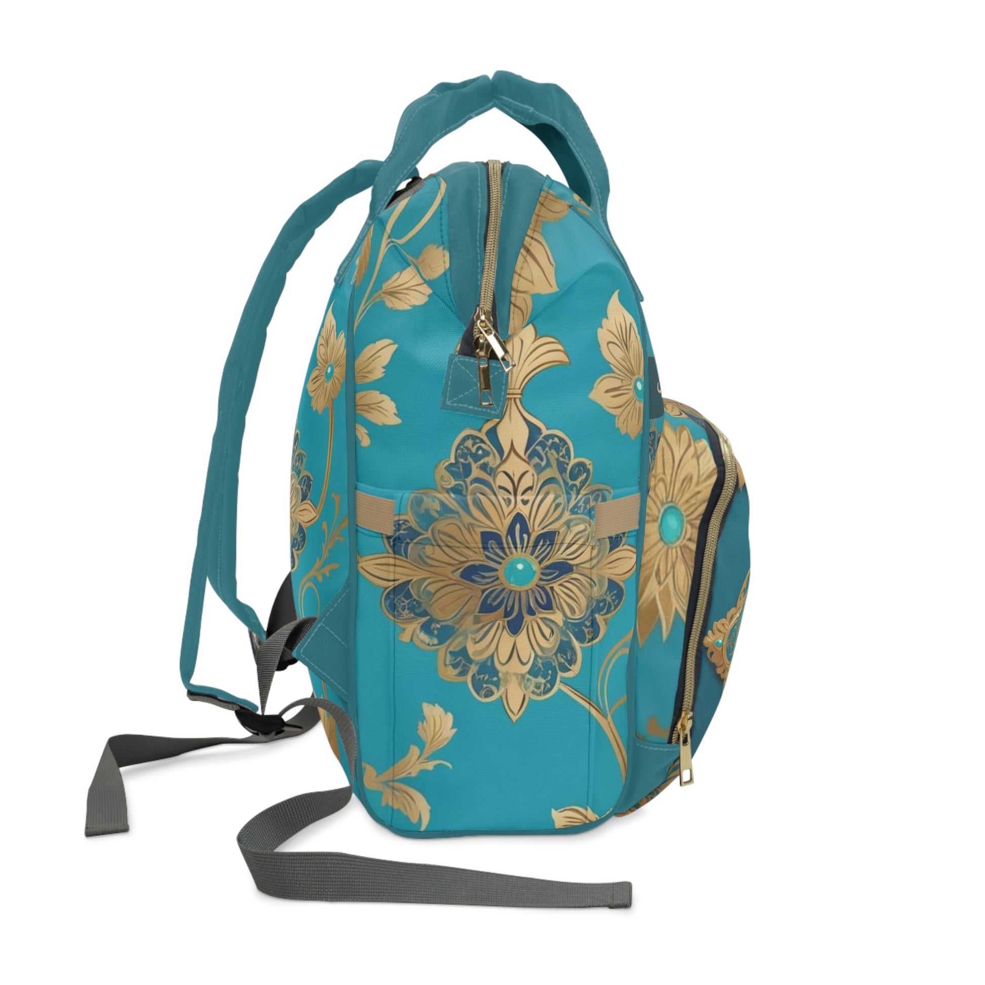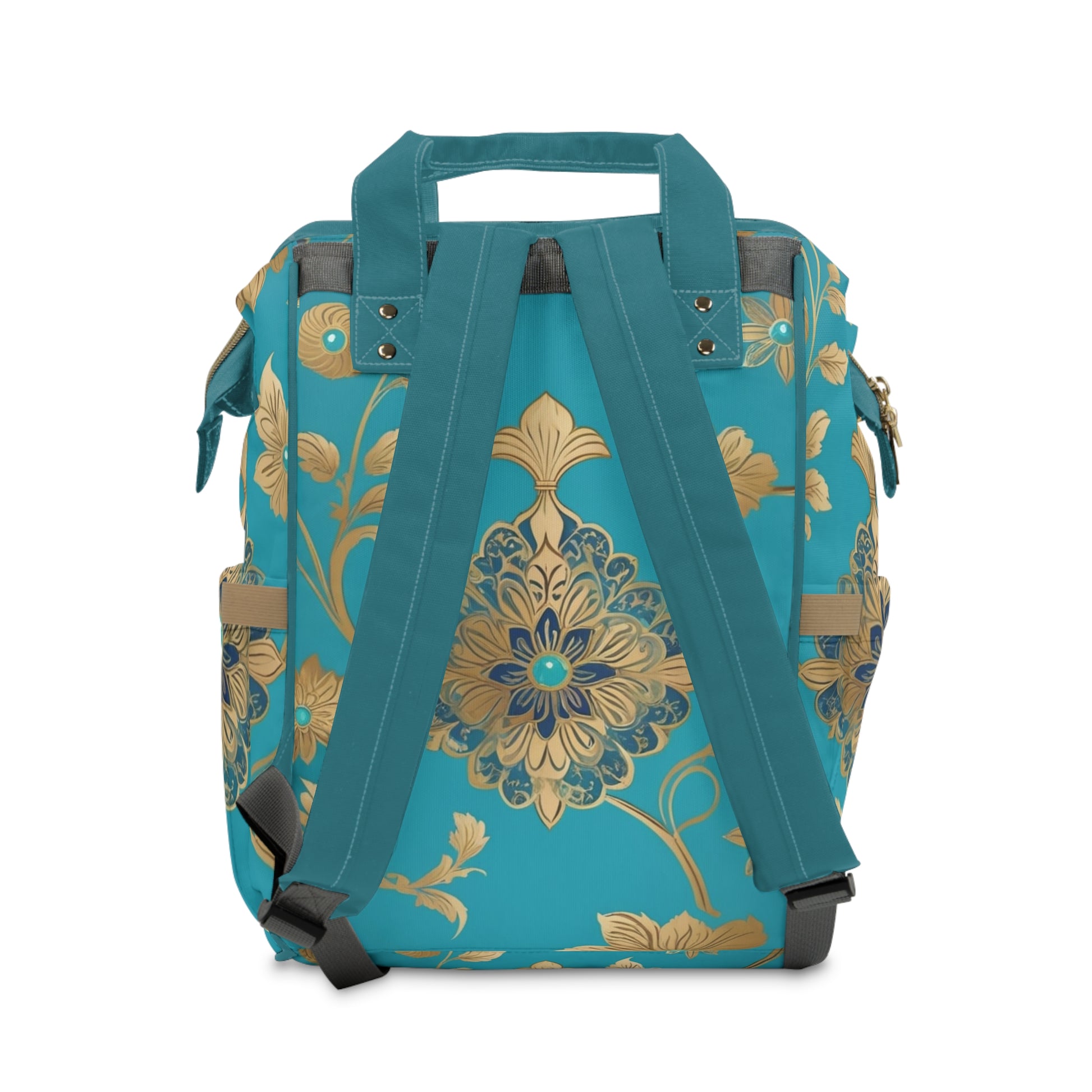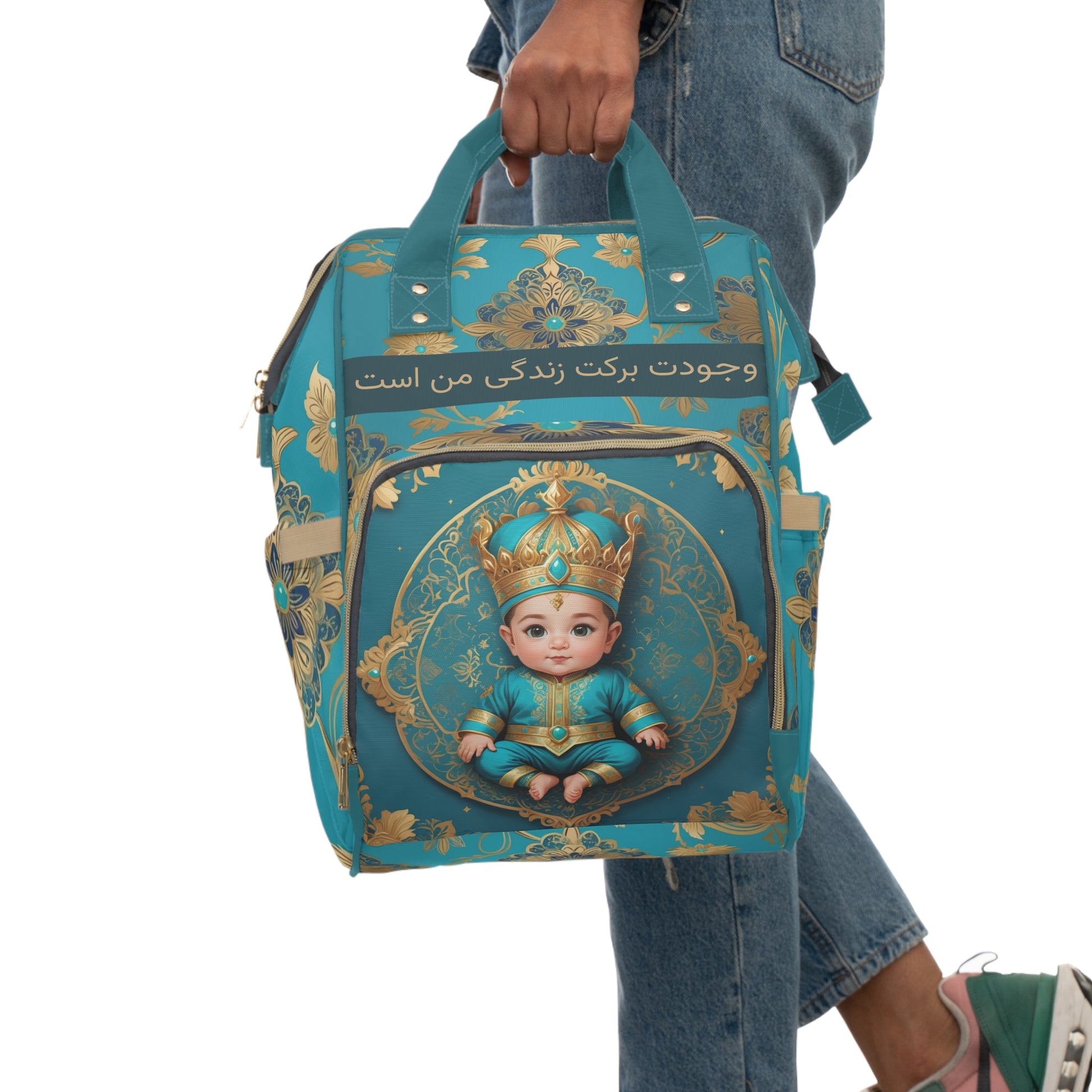This regal design features a sweet baby boy dressed in a royal turquoise and gold outfit with a jeweled crown, seated against an ornate Persian-inspired background. The Farsi inscription translates to “Your existence is the blessing of my life”, a touching message of love and gratitude. Spacious, waterproof, and durable — this diaper backpack blends cultural beauty with daily practicality, making it a meaningful and unique baby shower gift.