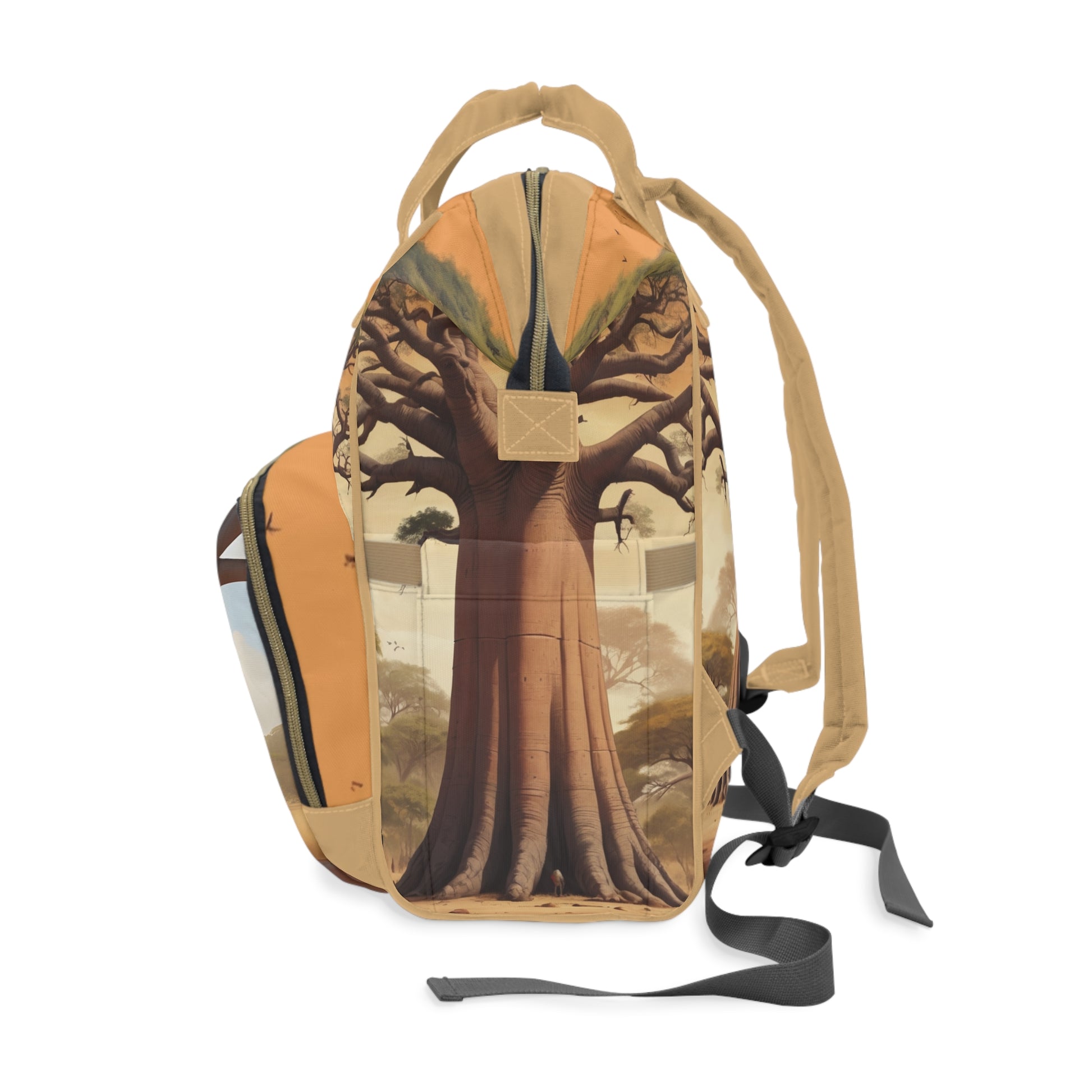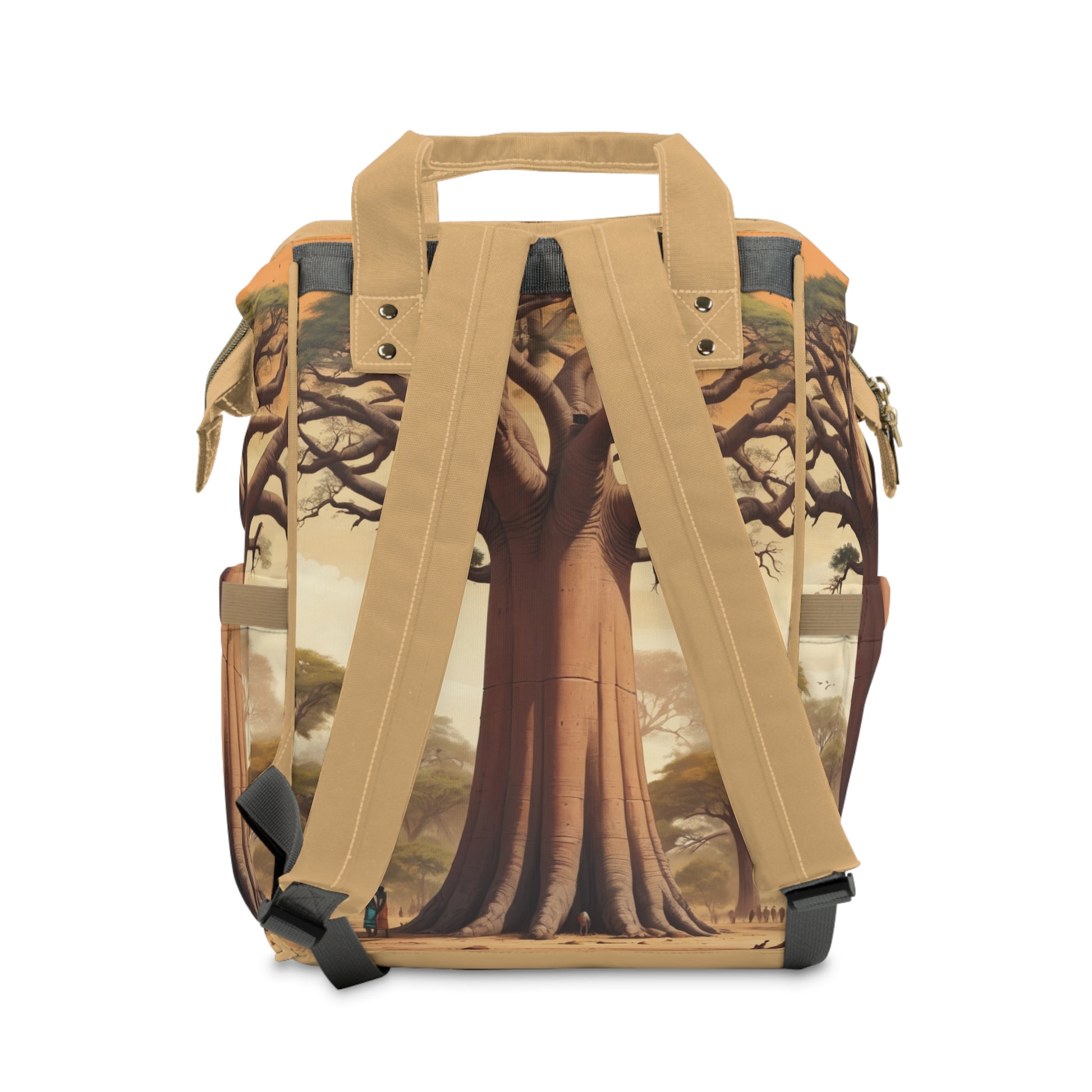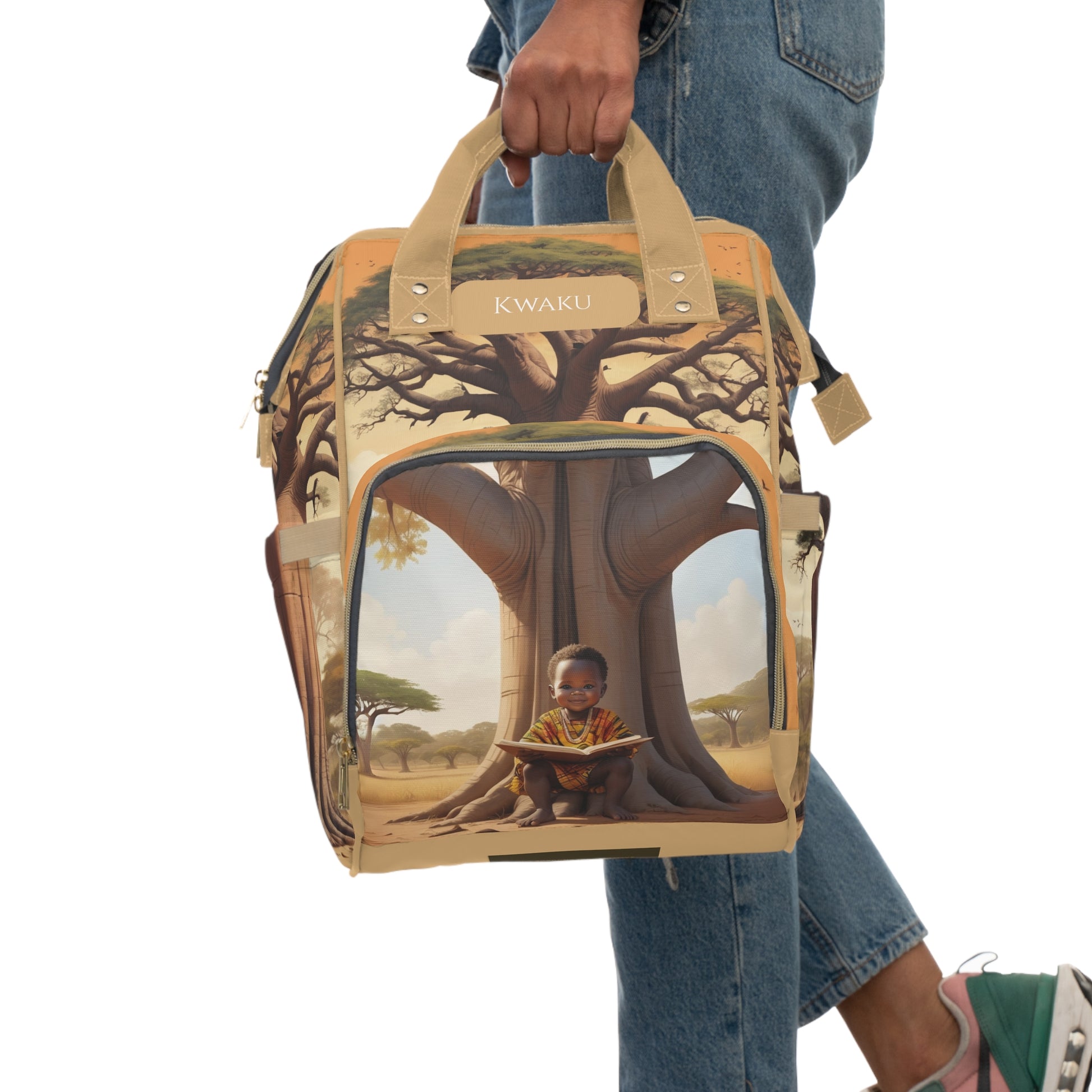The Boys Ghanaian Kente – Baobab Prince Diaper Bag (Kwaku Edition) symbolizes wisdom, resilience, and heritage. Featuring a young prince seated beneath the majestic baobab tree, this design honors the tree of life, a powerful African symbol representing strength, community, and continuity. Dressed in Kente attire, the prince reflects the deep connection between tradition and the future.