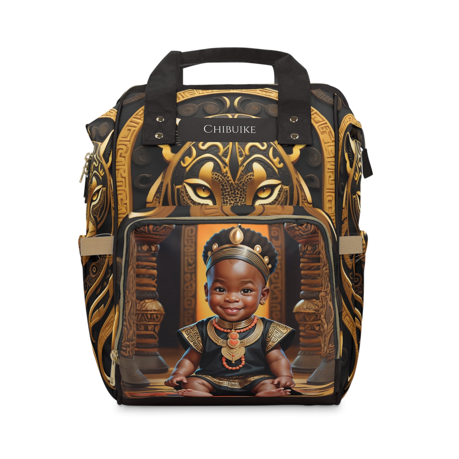 This bold design features a smiling Igbo baby prince dressed in regal black and gold attire, seated before a throne adorned with powerful leopard motifs, a sacred symbol of authority and protection in Igbo culture. His coral beads and golden ornaments reflect prosperity and resilience. The Igbo name Chibuike means “God is strength”, a blessing that embodies divine power, endurance, and confidence. This diaper bag is more than a daily essential — it is a celebration of heritage and strength for your little one.