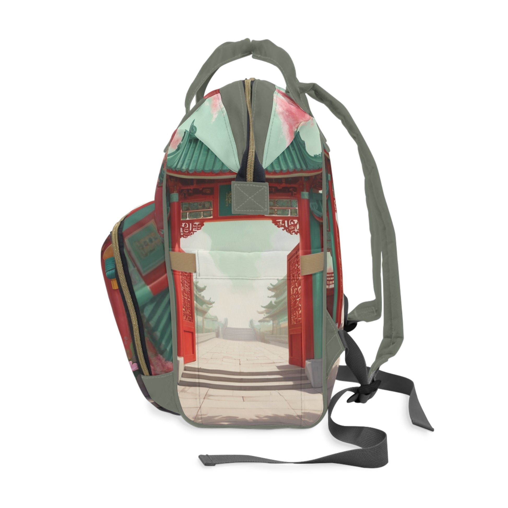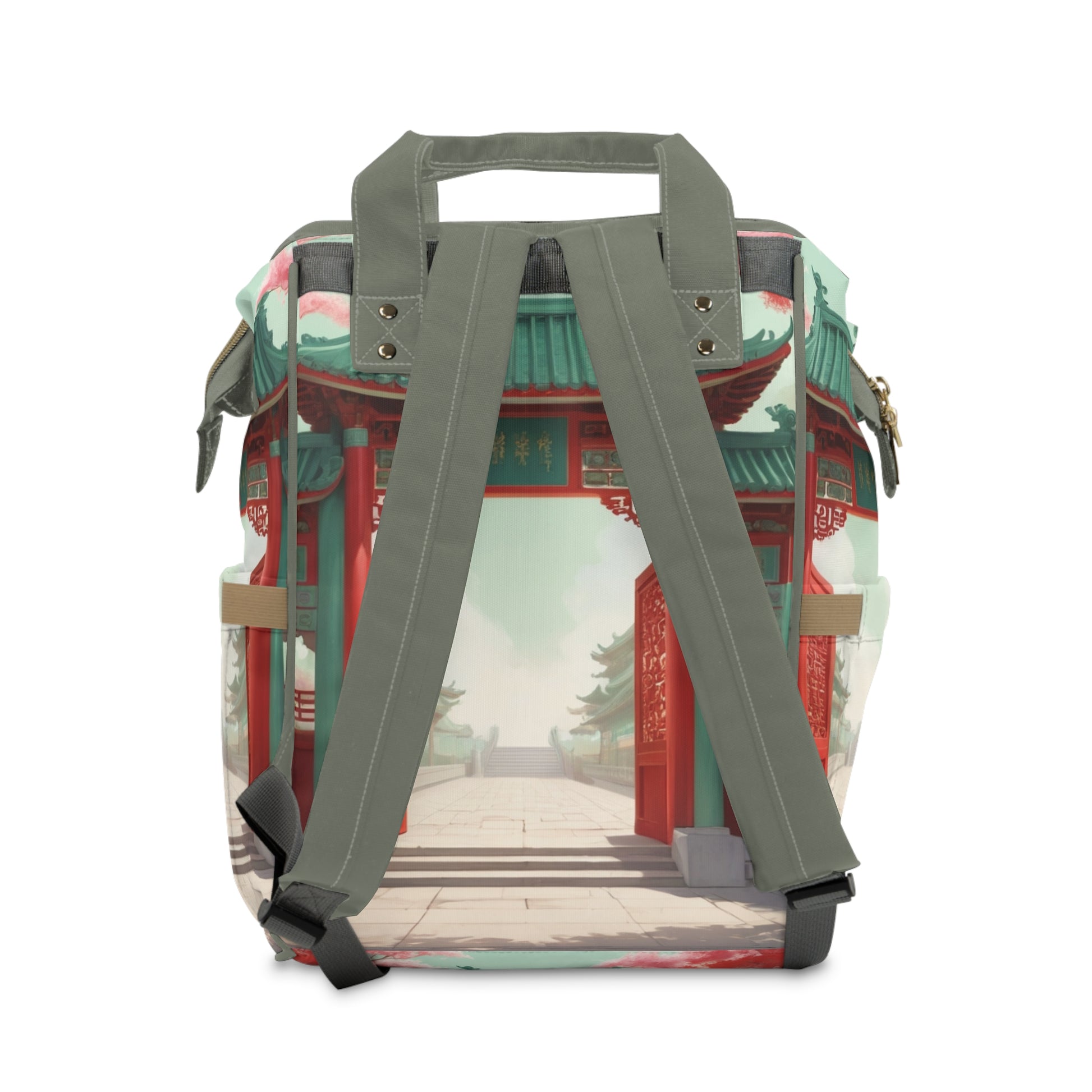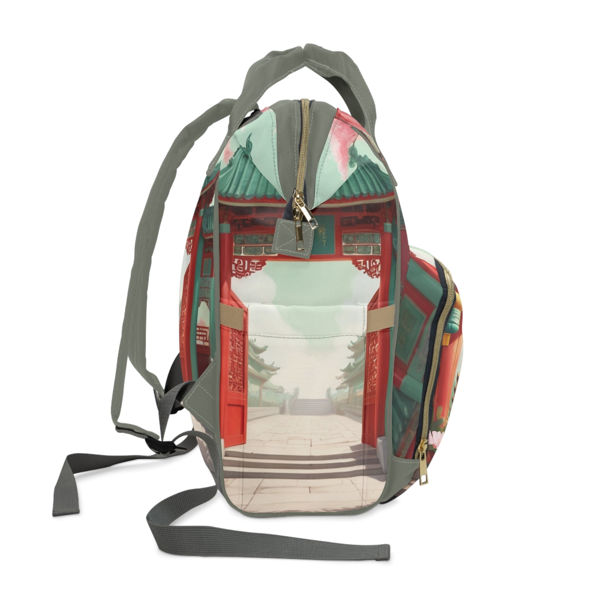 Celebrate joy and protection with our Girls Diaper Bag – Chinese Guardian Kitty Edition. This adorable design features a playful kitten with bright green eyes, wearing a jade necklace with a golden charm, sitting in front of a traditional Chinese temple gate. Cats are cherished as lucky and protective symbols, while the temple scenery adds cultural depth and elegance.