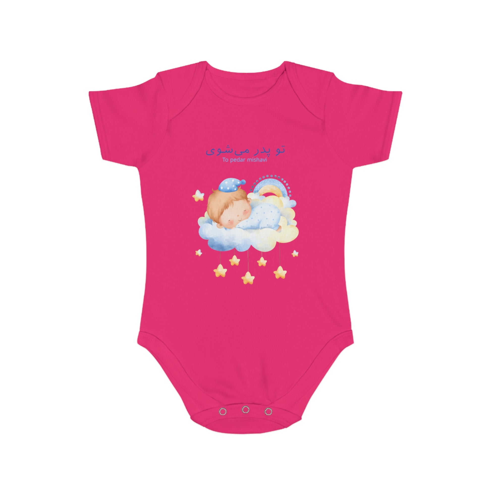 The design features a dreamy illustration of a baby resting on a fluffy cloud with stars hanging below and a rainbow shining above. The gentle pastel colors and Persian calligraphy create a warm and emotional keepsake that makes every reveal moment unforgettable. Whether for a family announcement, a photoshoot or as a unique cultural baby gift, this romper blends tradition with modern baby art in a truly special way.