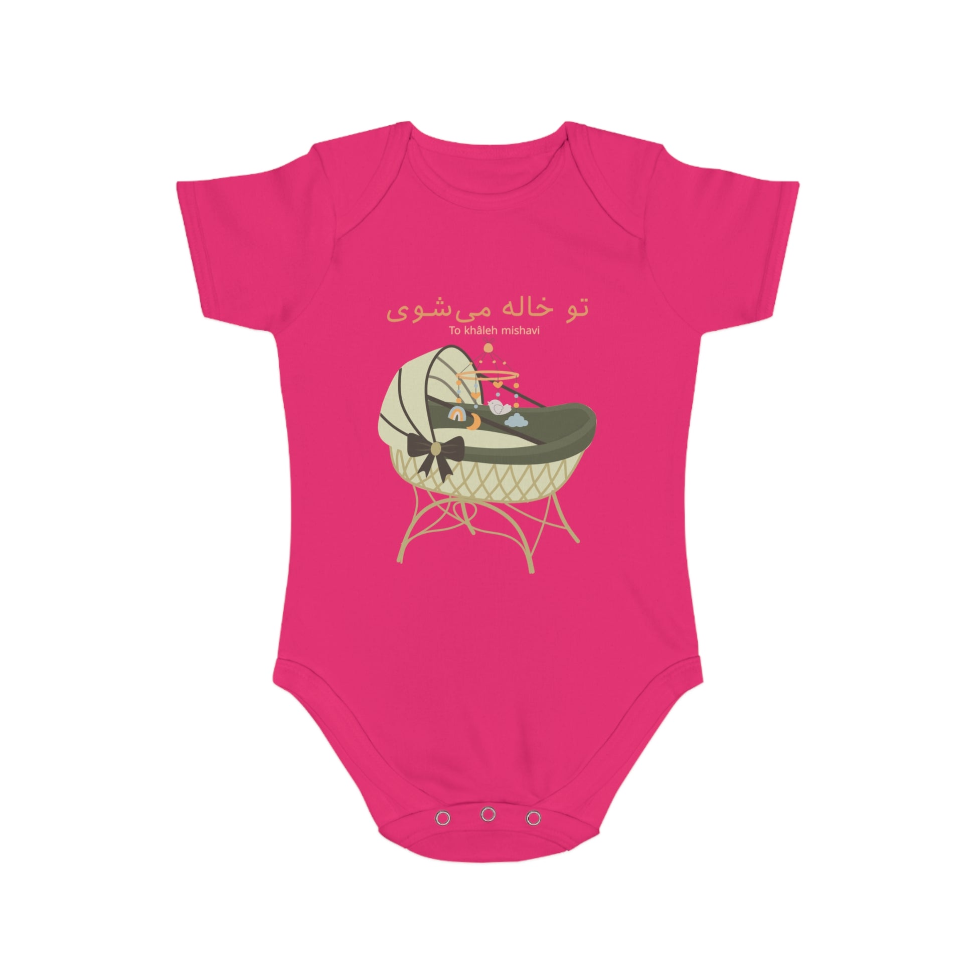 Celebrate a new chapter in the family with this unique Farsi baby announcement romper. The message تو خاله میشوی (To khâleh mishavi – You will be an aunt) turns a simple romper into a heartfelt surprise.