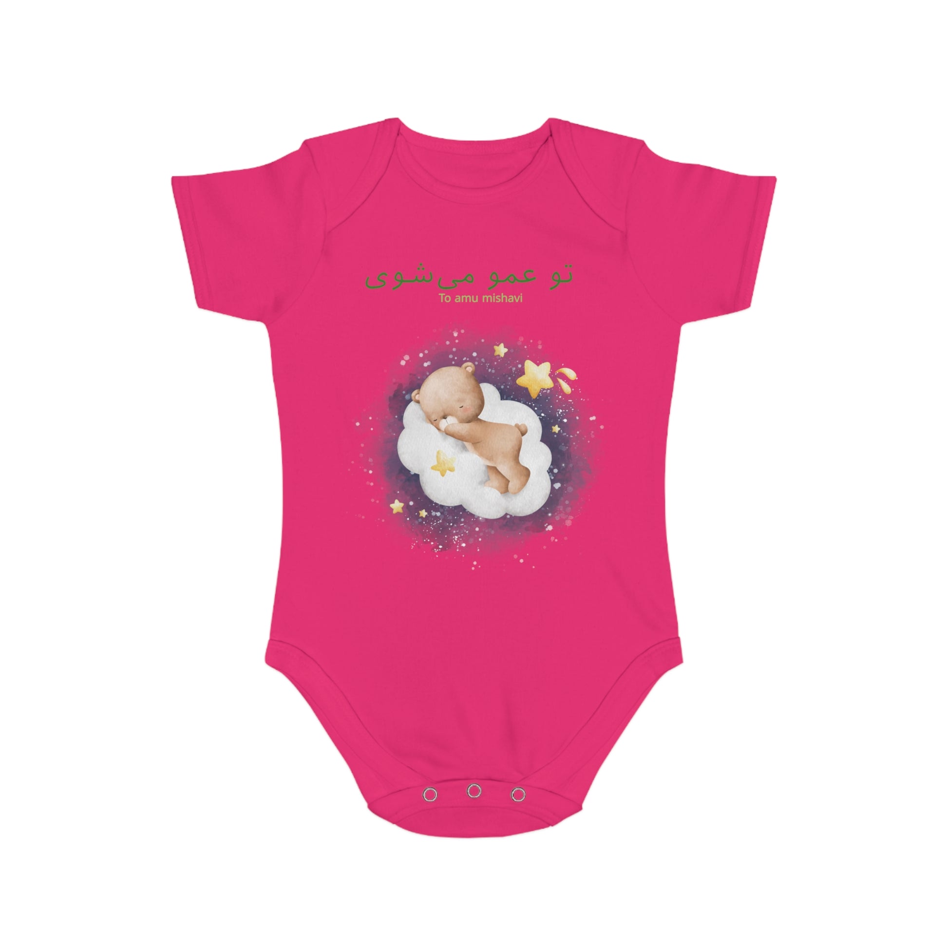This charming Farsi baby bodysuit is the sweetest way to announce “تو عمو میشوی” (To Amu Mishavi – You’re going to be an uncle). Featuring a sleeping teddy bear on a fluffy cloud with golden stars, the design brings warmth and joy to a very special family moment. Crafted from soft, breathable cotton, it’s perfect for newborn comfort while delivering a heartfelt message. A unique gift idea for Persian families celebrating pregnancy announcements and baby showers.