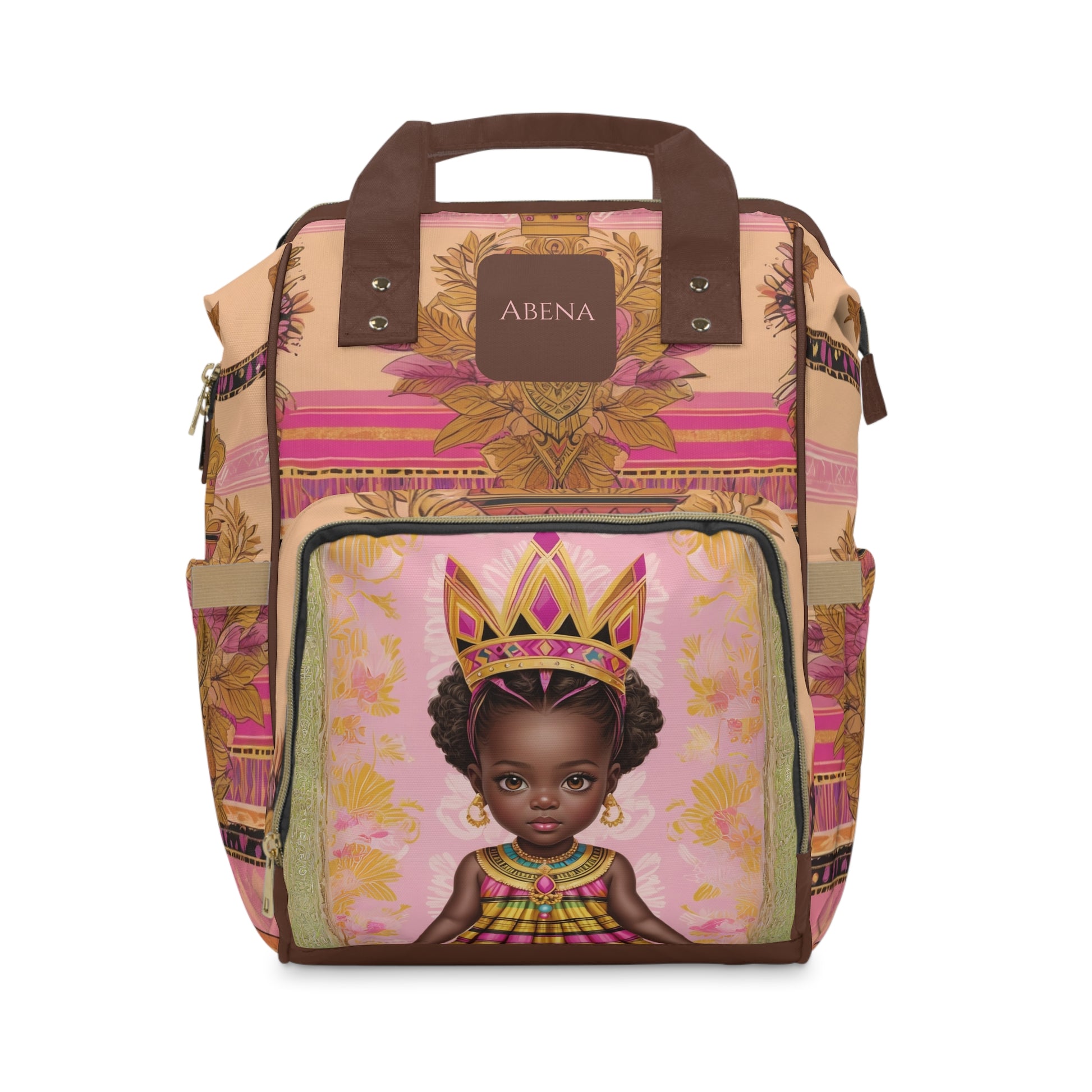 This stunning bag showcases a beautiful young princess adorned in traditional Ghanaian Kente patterns and royal jewelry, symbolizing pride, beauty, and cultural strength. The name Abena honors the Akan tradition of day-names, connecting every little girl to her roots and heritage. More than just a diaper bag, it is a personalized keepsake that blends cultural storytelling with modern practicality.