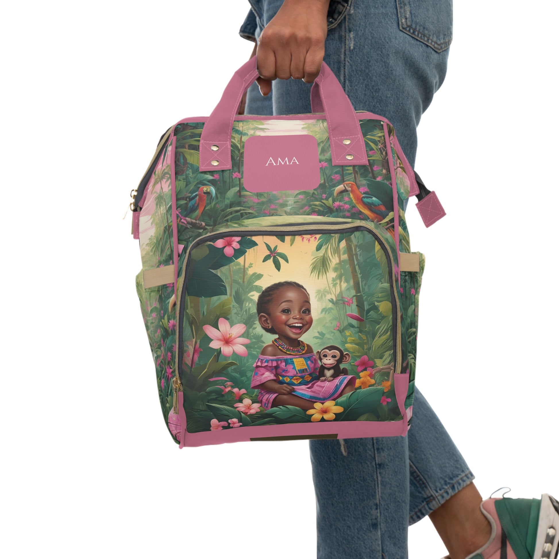 This lively bag showcases a young princess named Ama, born on Saturday in the Akan tradition, dressed in vibrant Kente attire and surrounded by tropical jungle life. With a playful monkey at her side, this design symbolizes curiosity, happiness, and cultural pride. More than just a diaper bag, it is a personalized keepsake blending storytelling, tradition, and everyday practicality.