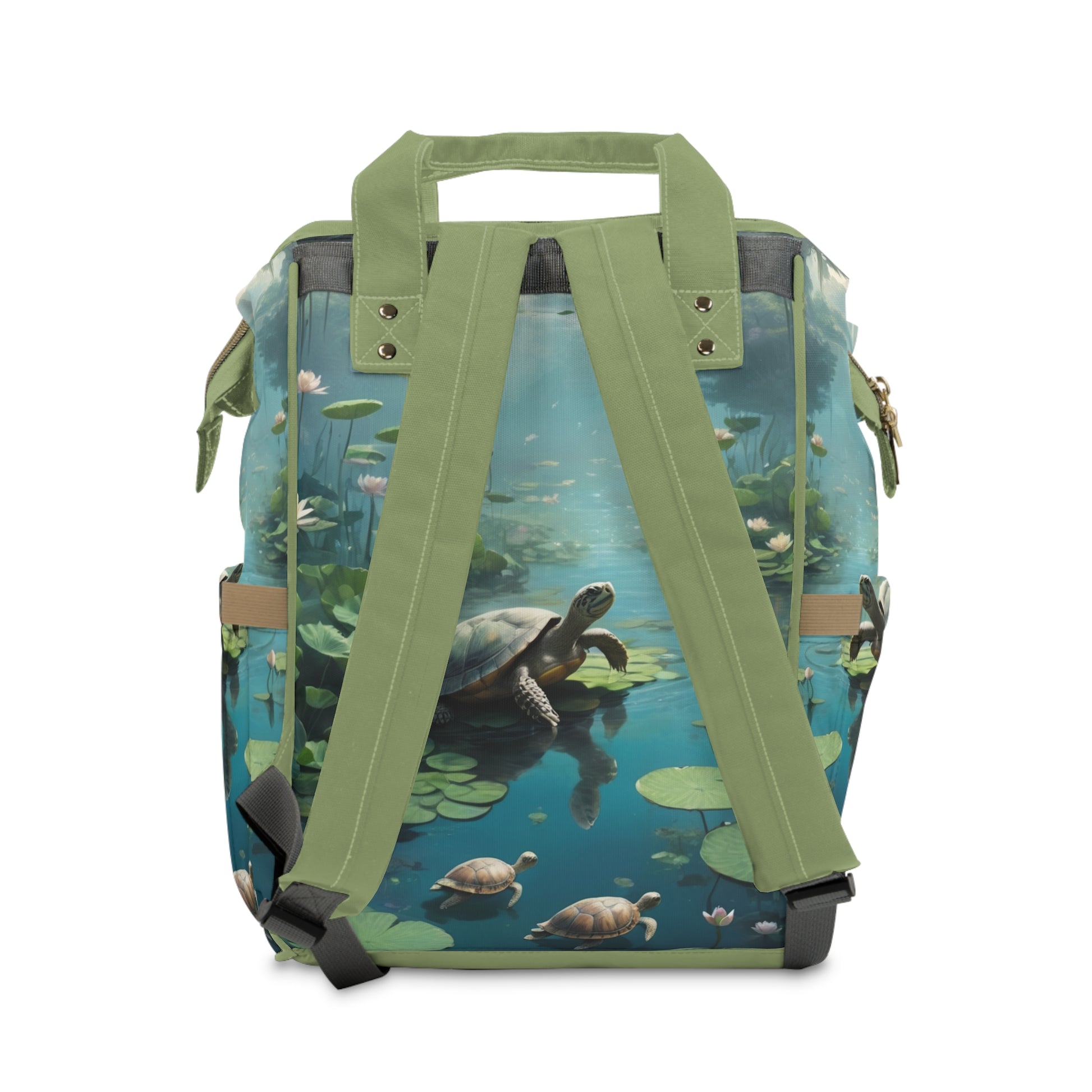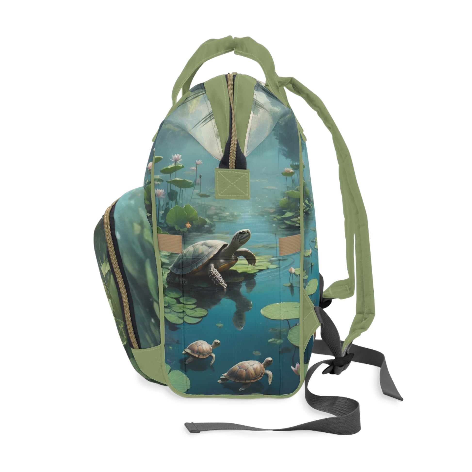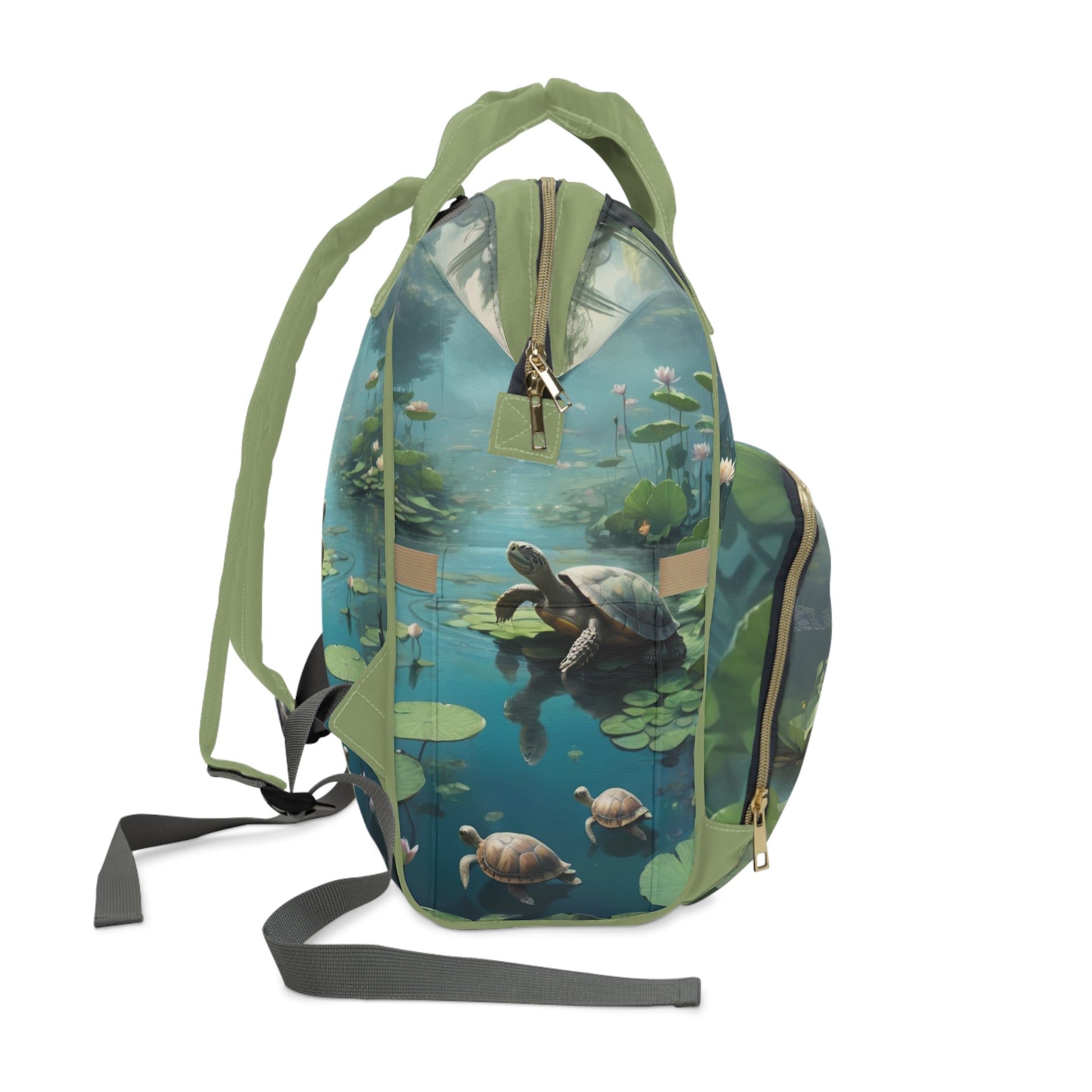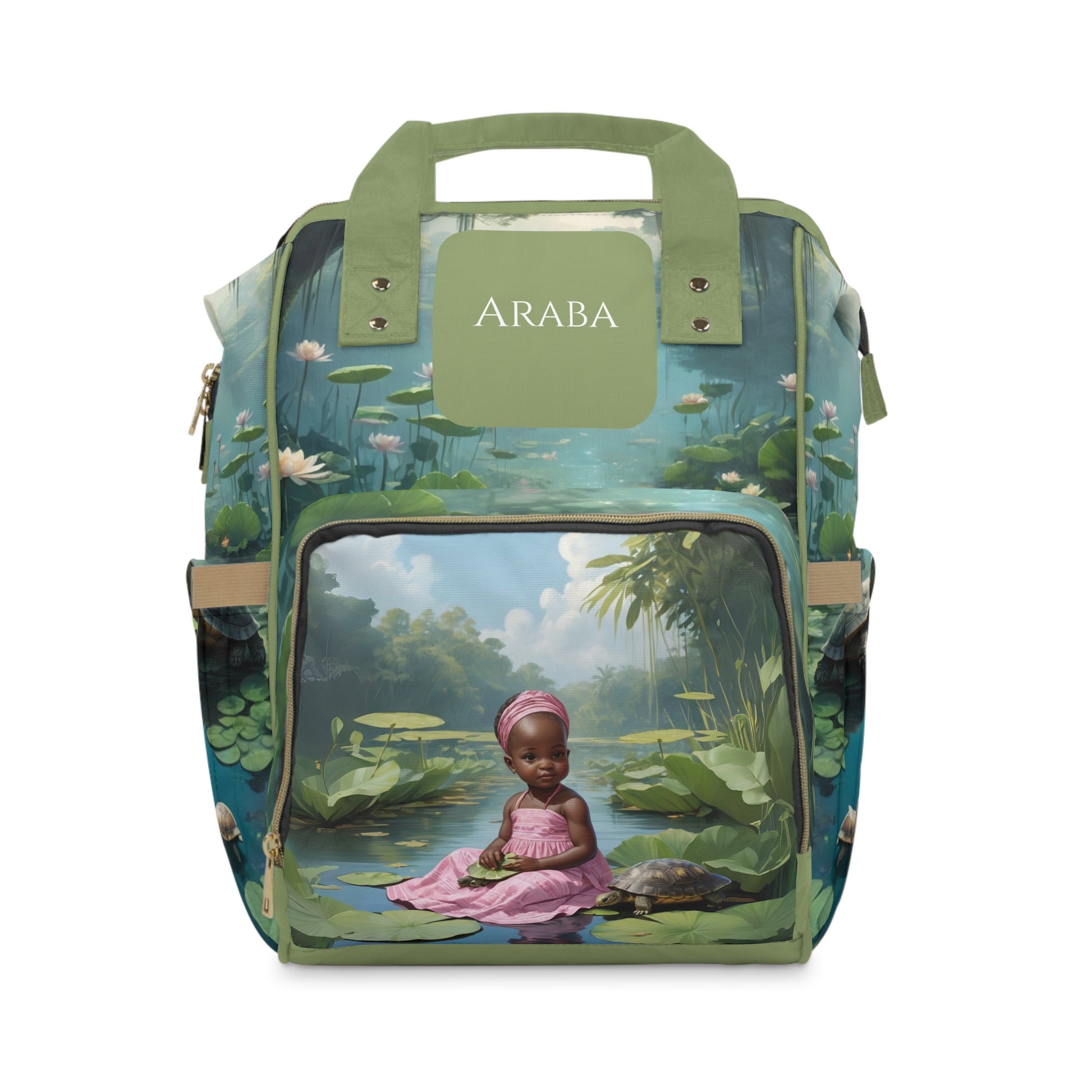 This enchanting design features a little princess named Araba, dressed in soft pink Kente-inspired attire, sitting gracefully by the water with a turtle beside her. The turtle, a powerful cultural symbol of patience, wisdom, and longevity, reflects the values of heritage and balance. Surrounded by lily ponds and calm waters, this bag combines storytelling and tradition with modern practicality. More than just a diaper bag, it is a personalized keepsake honoring culture and motherhood.