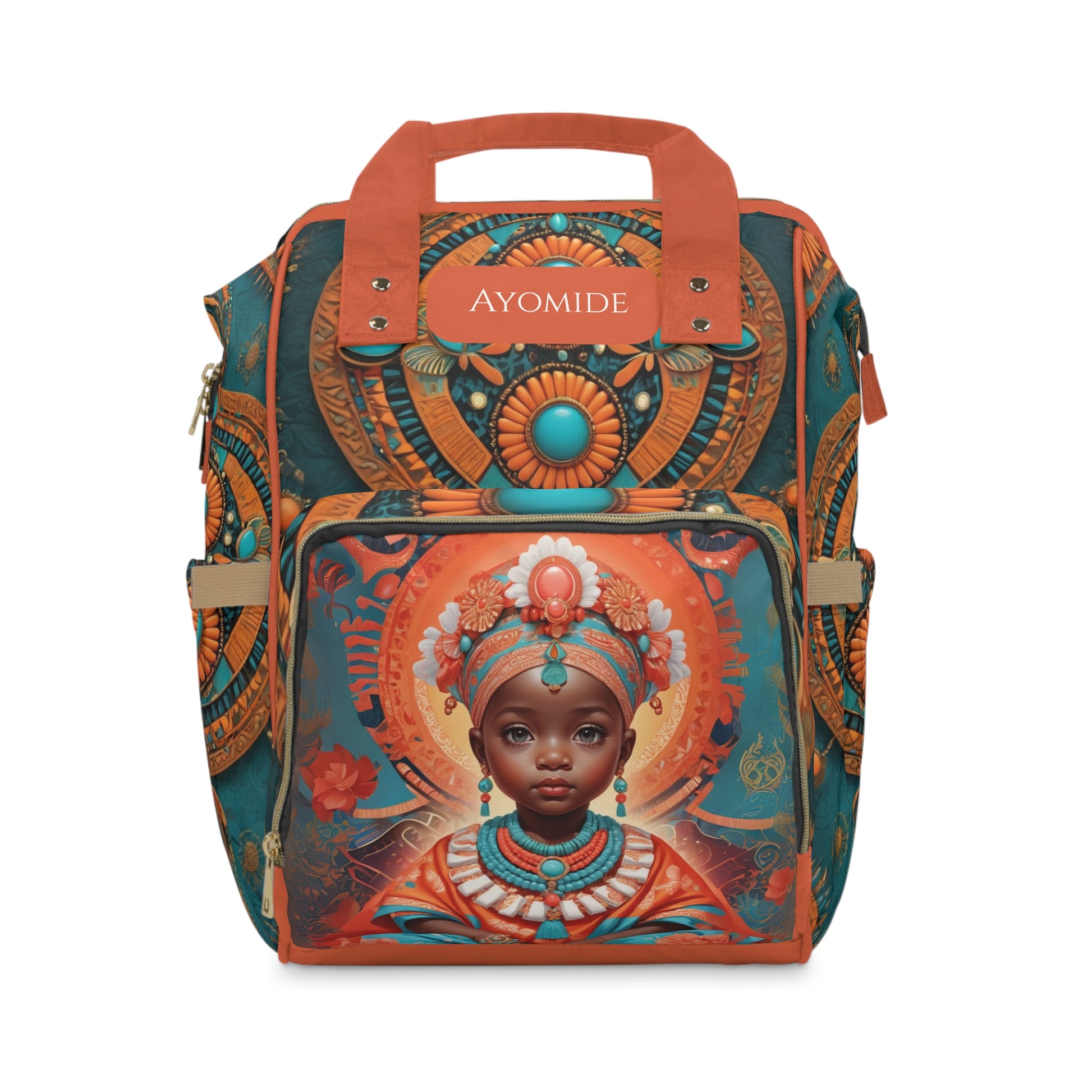This radiant bag features a Yoruba princess adorned in vibrant orange and turquoise, surrounded by intricate cultural ornaments that symbolize joy, tradition, and beauty. The name Ayomide means “my joy has arrived”, a meaningful Yoruba blessing that celebrates the gift of a child. More than a diaper bag, it is a personalized keepsake that blends heritage, elegance, and modern practicality.