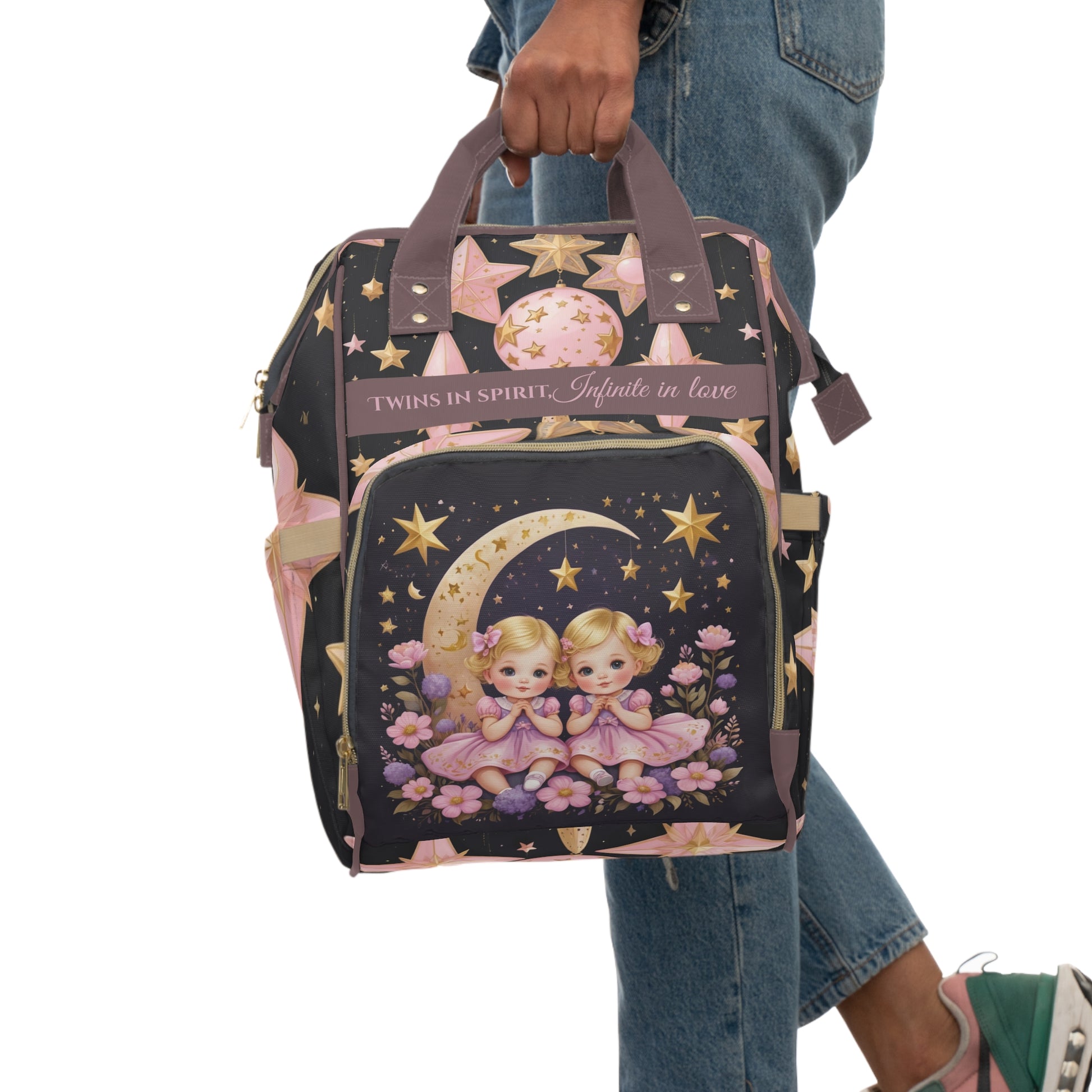 This magical design features twin baby girls sitting gracefully on a golden crescent moon, dressed in soft pink with floral details, surrounded by shimmering stars and cosmic accents. The Gemini symbol represents duality, curiosity, and deep bonds. The heartfelt slogan “Twins in spirit, Infinite in love” captures the true essence of Gemini girls, making this backpack a meaningful and symbolic keepsake.