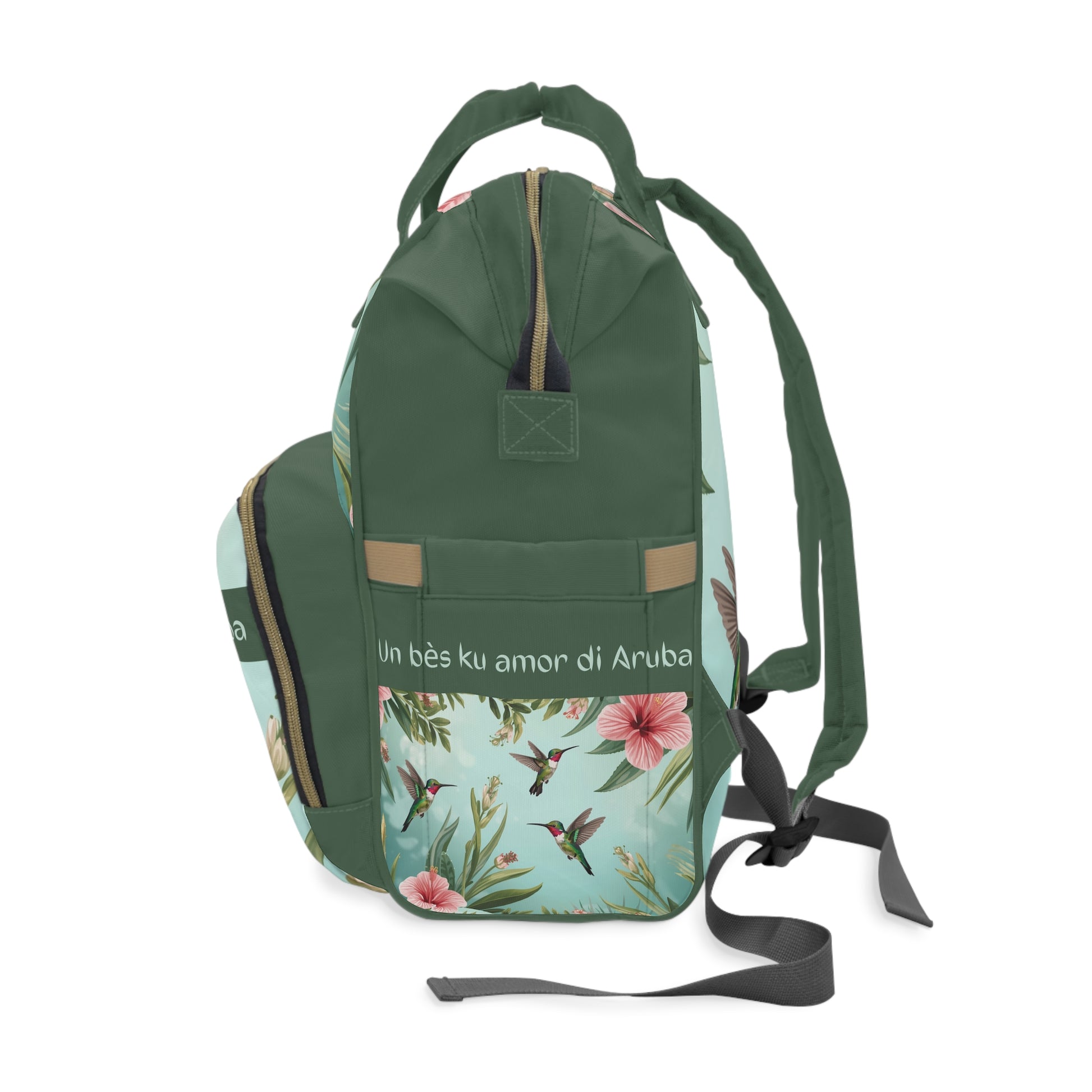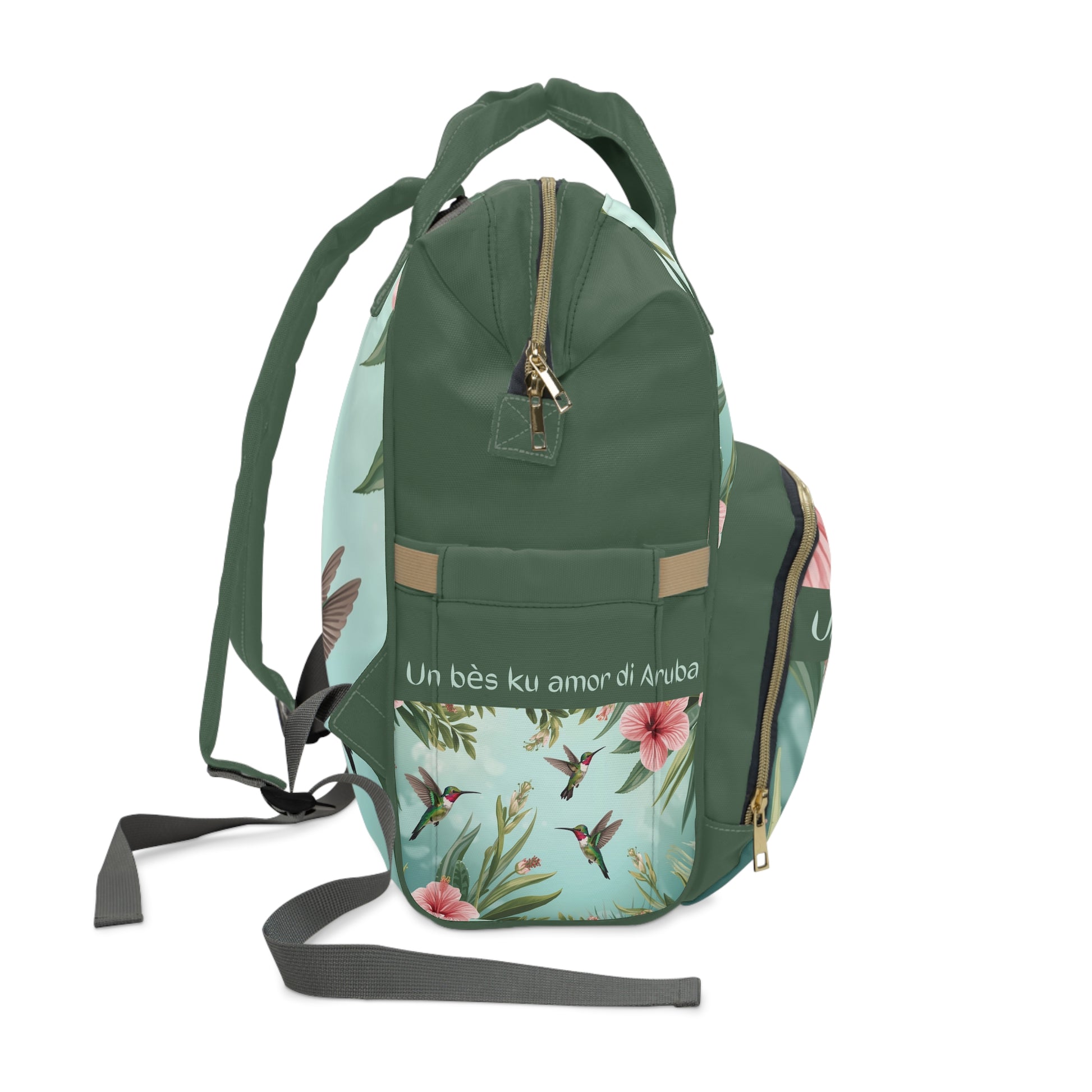 This Aruba-inspired design features delicate hummingbirds among colorful tropical flowers, symbolizing joy, freedom, and the vibrant spirit of the Caribbean. Waterproof, lightweight, and spacious, this diaper backpack is both practical and culturally meaningful — perfect for everyday use, travel, or as a unique baby shower gift.