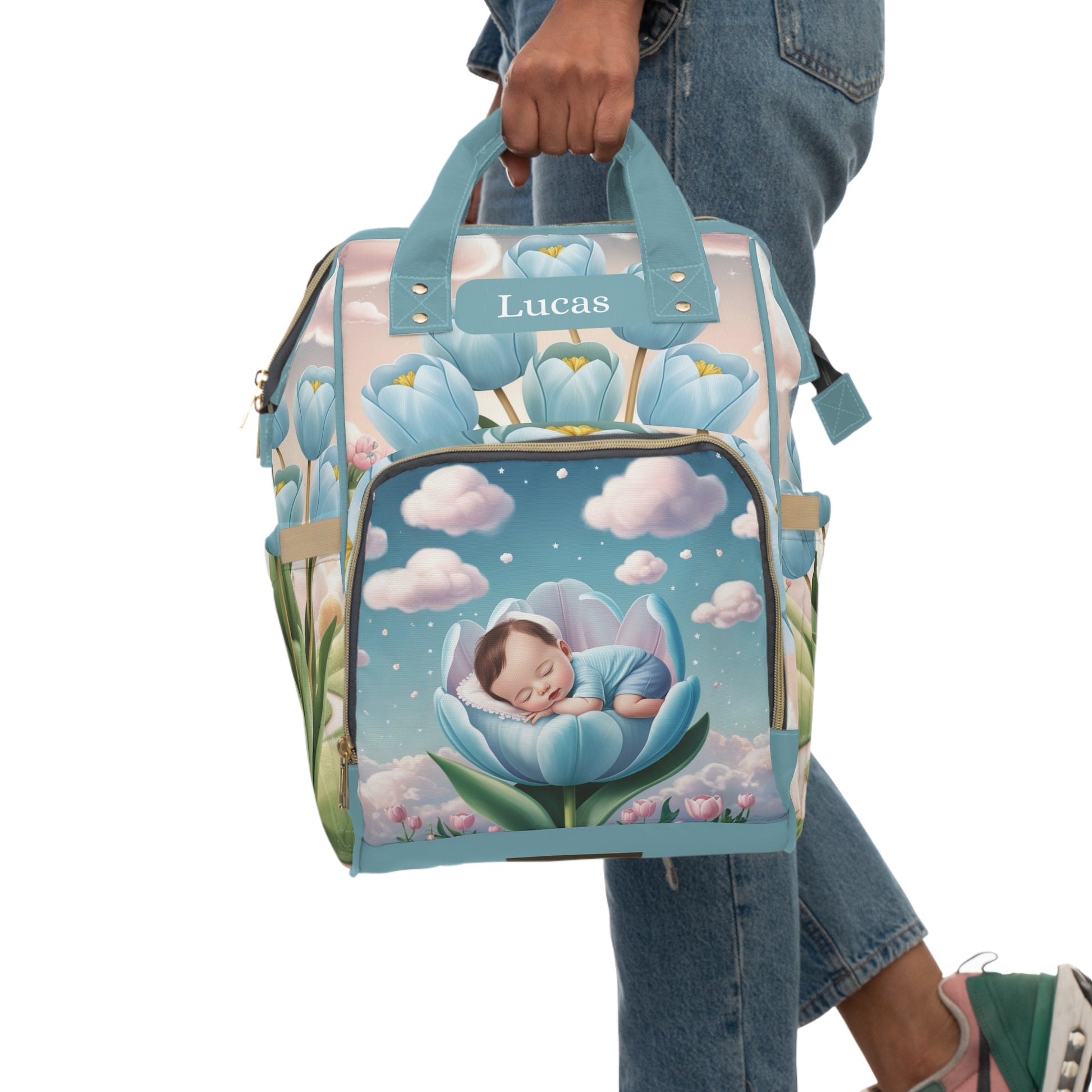 The Lucas Tulip Dreamer Baby Bag captures the purity, growth, and beauty of Dutch heritage. Inspired by the iconic tulip fields of the Netherlands, the design features soft pastel blue tulips blooming under a dreamy sky with fluffy clouds. At the center of the bag, a sweet little boy named Lucas is peacefully resting inside a tulip blossom, symbolizing new beginnings, love, and hope. The name Lucas, derived from “light,” reflects brightness and joy in every journey.