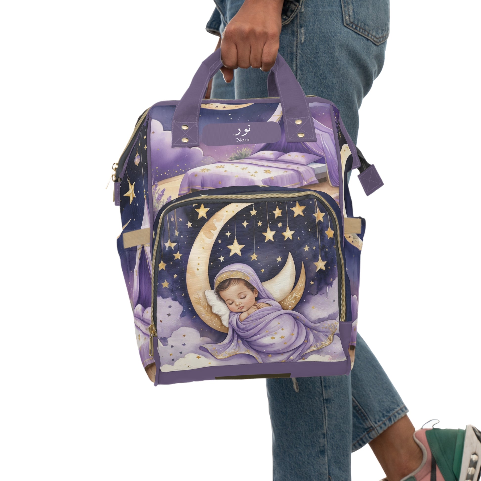 The Noor Baby Bag brings a touch of magic to everyday parenting. Featuring a dreamy design with golden stars, a crescent moon, and a peacefully sleeping baby wrapped in purple, this bag is a celebration of love, culture, and heritage. The Arabic name "نور" (Noor) adds an elegant personal touch, blending tradition with modern style.