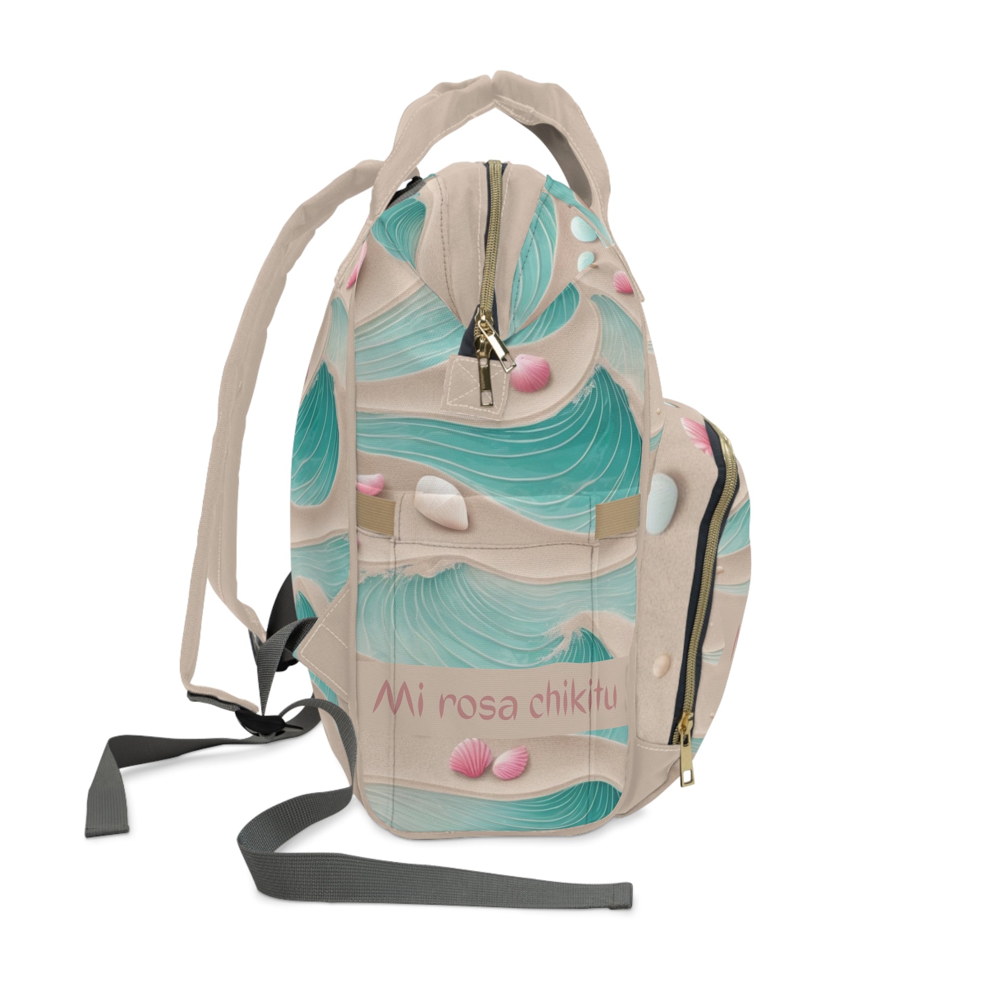 This coastal-inspired design features flowing ocean waves and delicate seashells in soft tones, creating a serene and refreshing look. Lightweight, waterproof, and stylish — this diaper backpack is perfect for beach-loving families, summer outings, or as a unique baby shower gift.