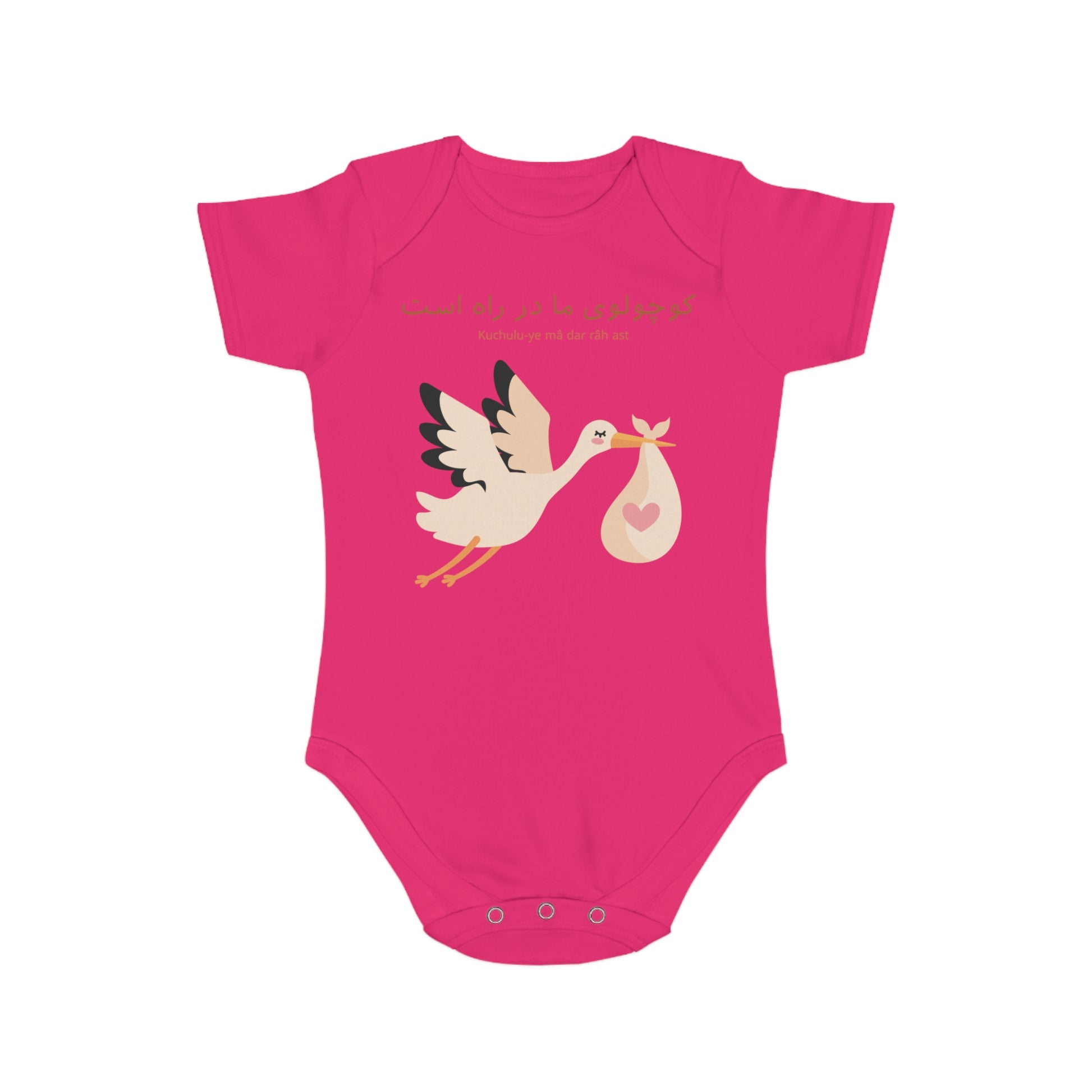 Announce your joyful news with this adorable Persian baby romper featuring the phrase "Kuchulu-ye ma dar rah ast" which means "Our little one is on the way." The timeless stork illustration with a heart bundle symbolizes love, hope, and new beginnings. Made from soft, breathable cotton, this romper combines comfort with cultural charm, making it a unique way to share your pregnancy with loved ones. Ideal for baby announcements, baby shower gifts, or as a memorable keepsake for expecting parents.