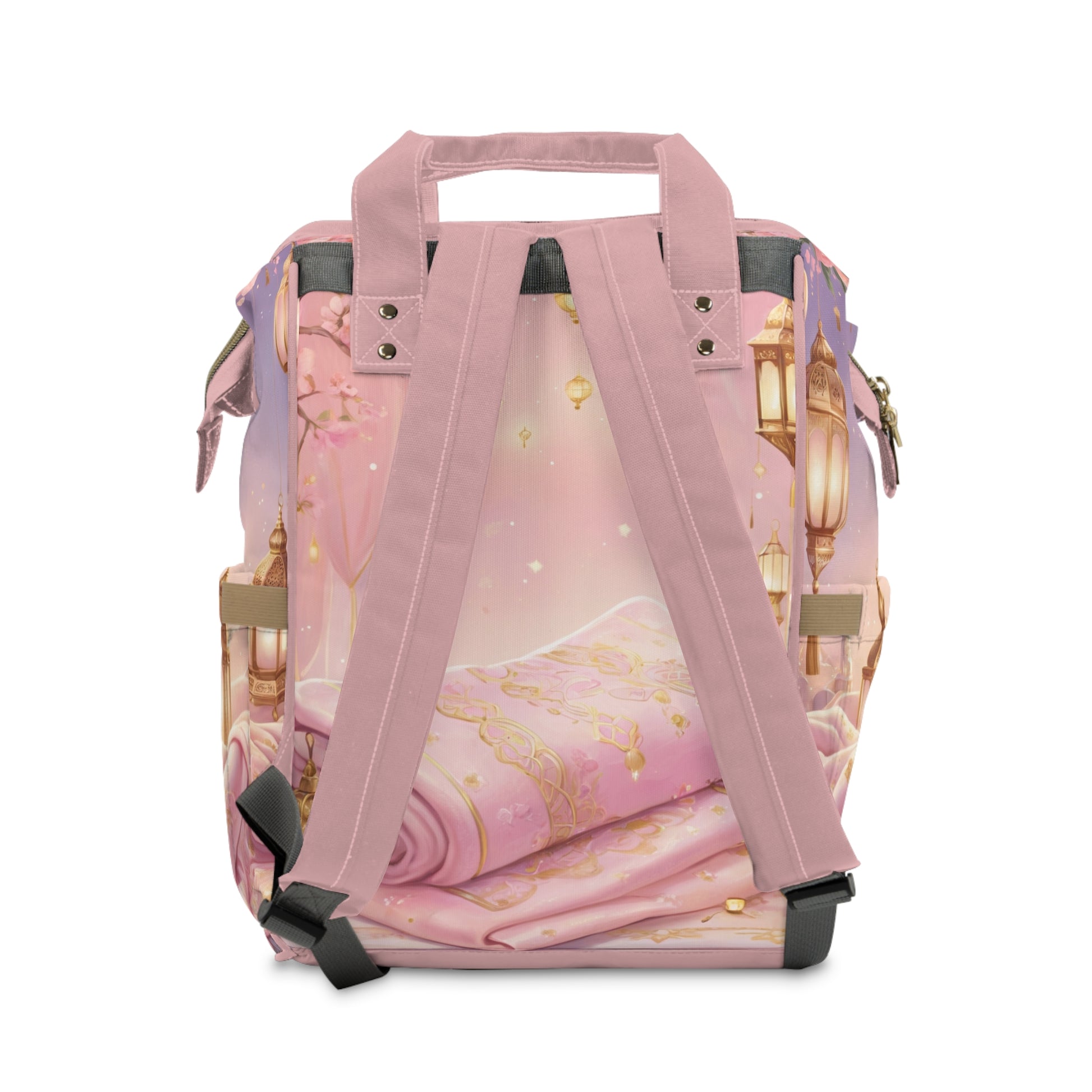The Salma Arabic Baby Bag embodies grace, tenderness, and timeless beauty. Wrapped in soft pink and gold tones, this design features baby Salma peacefully resting beneath a glowing crescent moon surrounded by lanterns — a symbol of light, love, and protection.