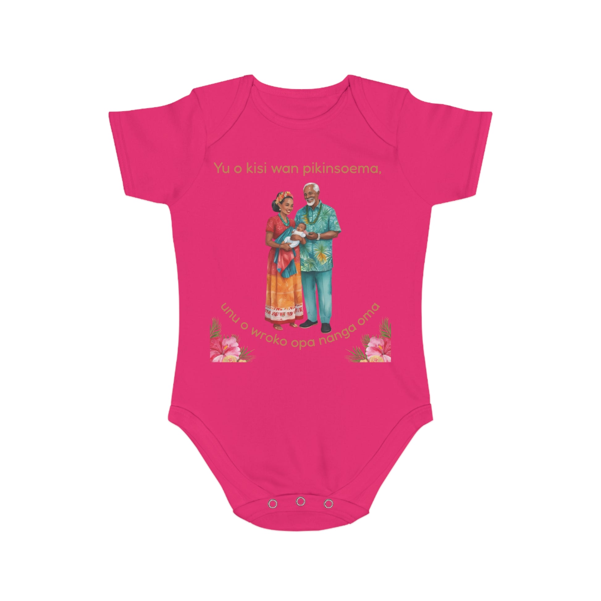 Celebrate the joy of family with this Surinamese baby announcement bodysuit featuring the heartfelt message “Yu o kisi wan pikinsoema, unu o wroko opa nanga oma” (You will receive a grandchild, you are going to be grandparents).