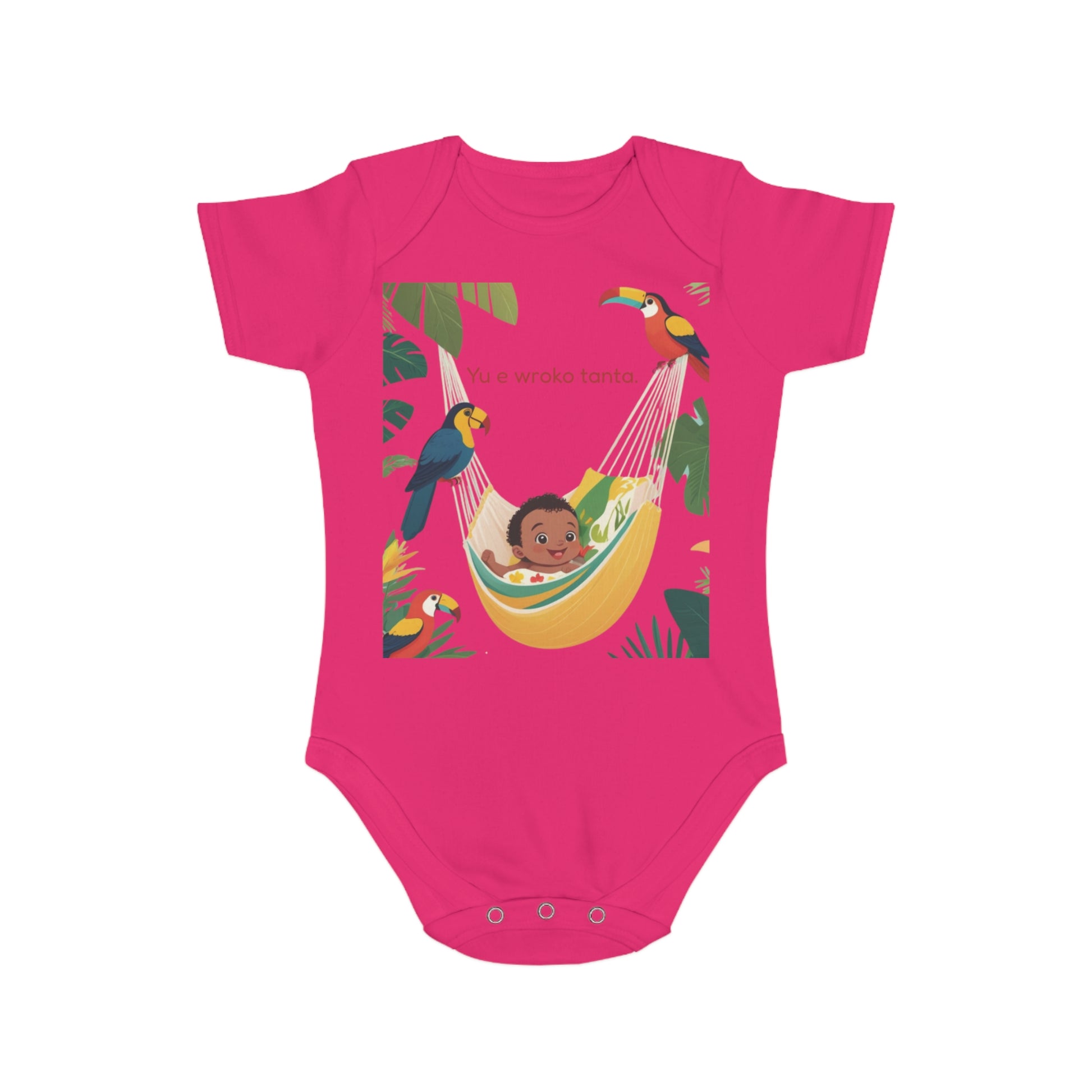 Surprise your family in a unique way with this Surinamese baby announcement bodysuit featuring the message “Yu e wroko tanta” (You are going to be an aunt).