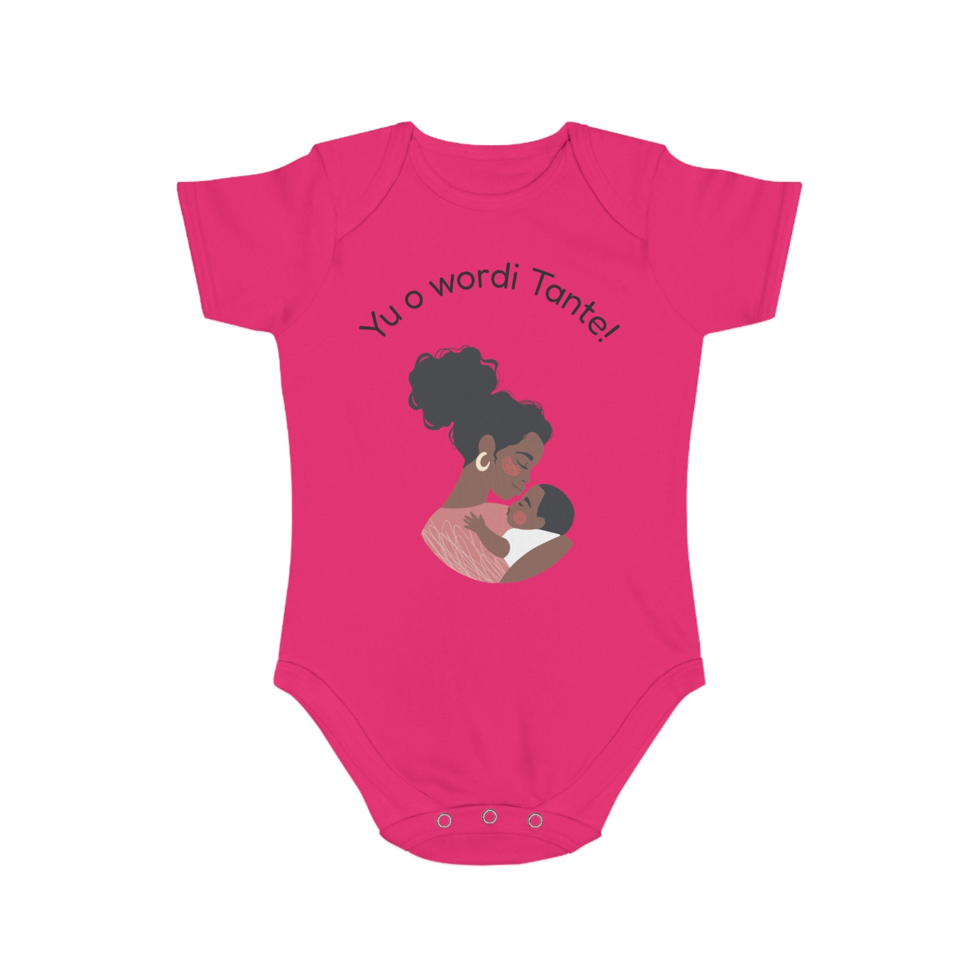Share the joy of new beginnings with this adorable baby announcement bodysuit featuring the Surinamese phrase “Yu o wordi Tante,” which means “You will become an aunt.” A perfect way to surprise your sister or loved one with exciting news, this soft cotton romper makes a memorable pregnancy reveal gift. The sweet design of a caring aunt holding a baby adds a heartfelt touch, making it ideal for baby showers, family surprises, and treasured keepsakes.