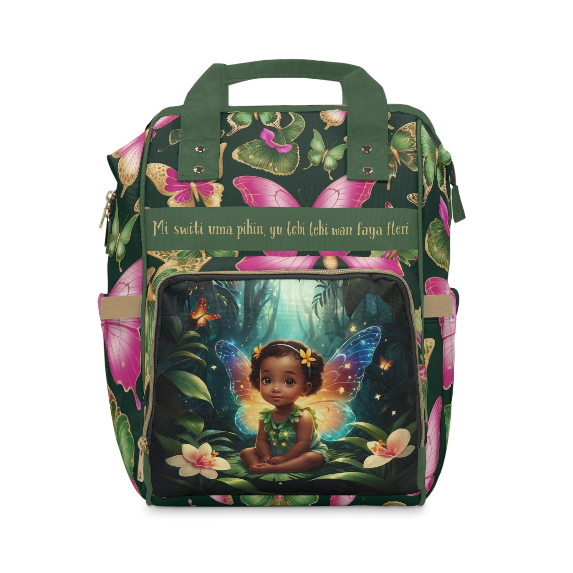 This enchanting bag features a sweet Surinamese baby girl with glowing fairy wings, surrounded by vibrant butterflies, tropical flowers, and lush jungle leaves. The Surinamese phrase “Mi switi uma pikin, yu lobi leki wan faya fleri” translates to “My sweet little girl, you shine like a fiery flower.” It beautifully captures the innocence, love, and sparkling spirit of Surinamese culture. This backpack is not only a practical daily essential but also a keepsake filled with cultural pride and fairy-tale wonder.