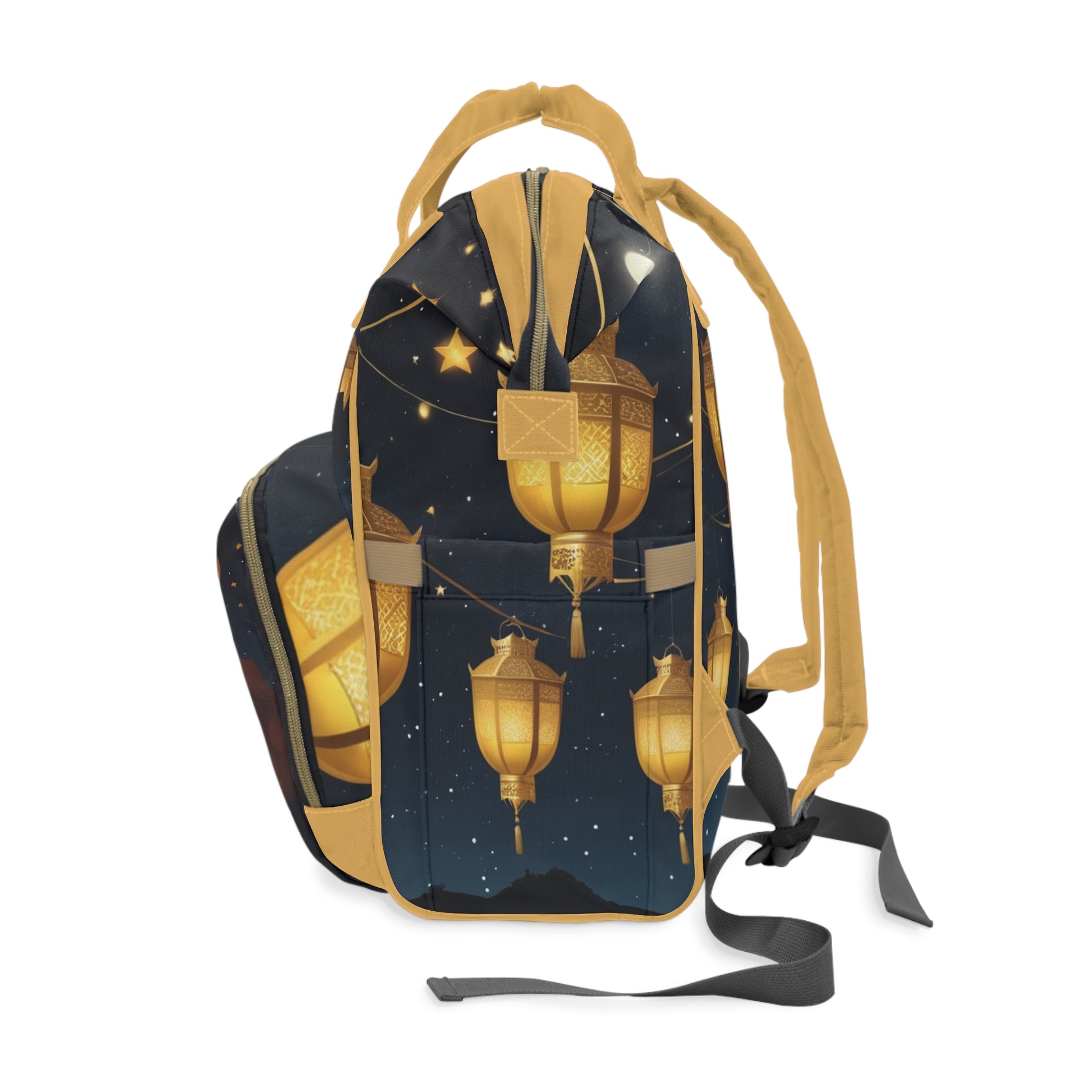 This enchanting diaper bag shows a beautiful Surinamese baby girl holding a glowing lantern under a starlit sky, surrounded by warm golden details. The Surinamese phrase “Mi switi uma pikin, yu bribi leki wan lanti na doro” translates to “My sweet little girl, you shine like a lantern at the door”. A heartfelt message that brings tradition and tenderness together.