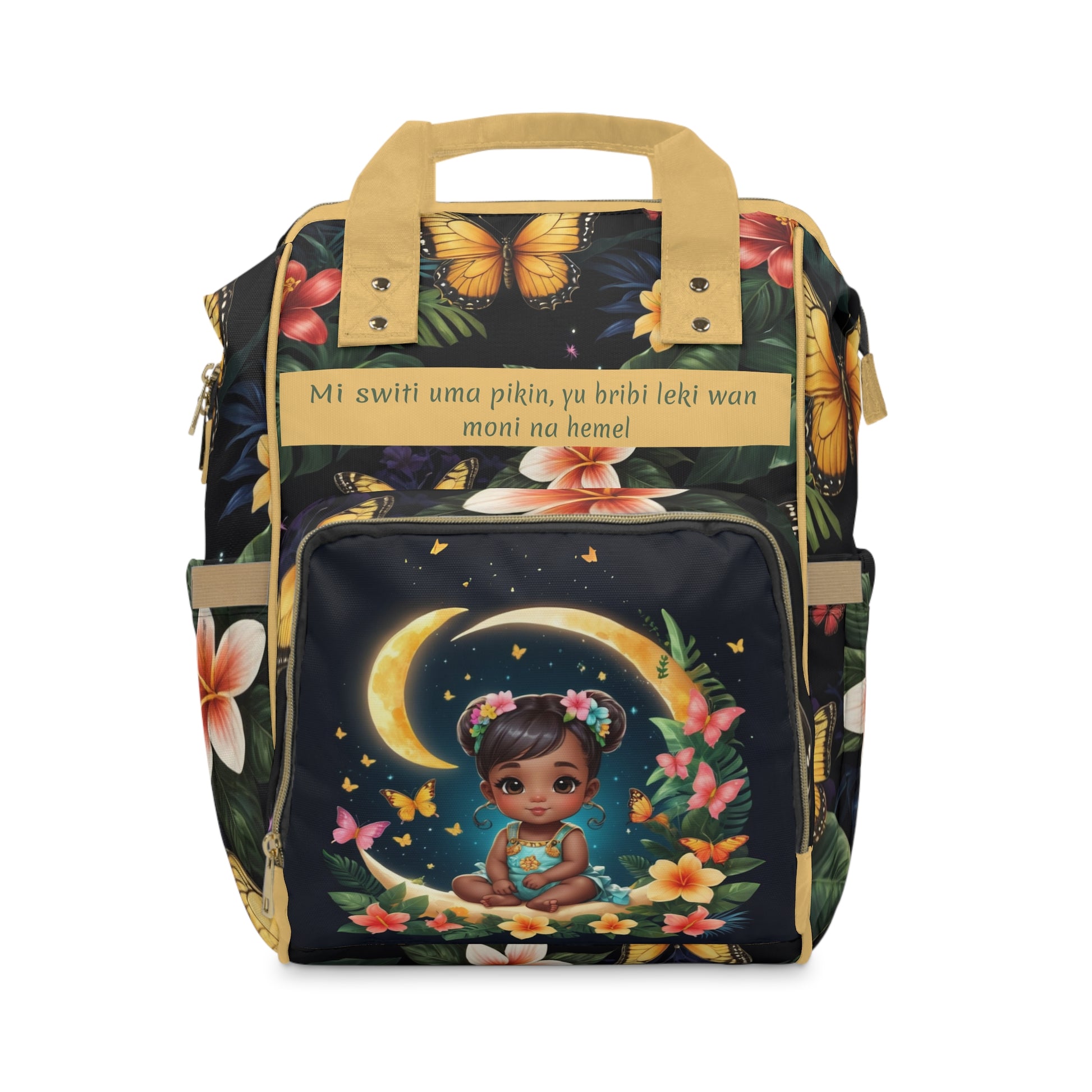 This enchanting bag features a sweet baby girl surrounded by glowing butterflies, tropical flowers, and the golden crescent moon. The Surinamese phrase “Mi switi uma pikin, yu bribi leki wan moni na hemel” translates to “My sweet girl, you shine like a moon in the sky.” A perfect blend of practicality and cultural storytelling, this diaper bag becomes more than just an everyday essential — it is a personalized keepsake full of love.