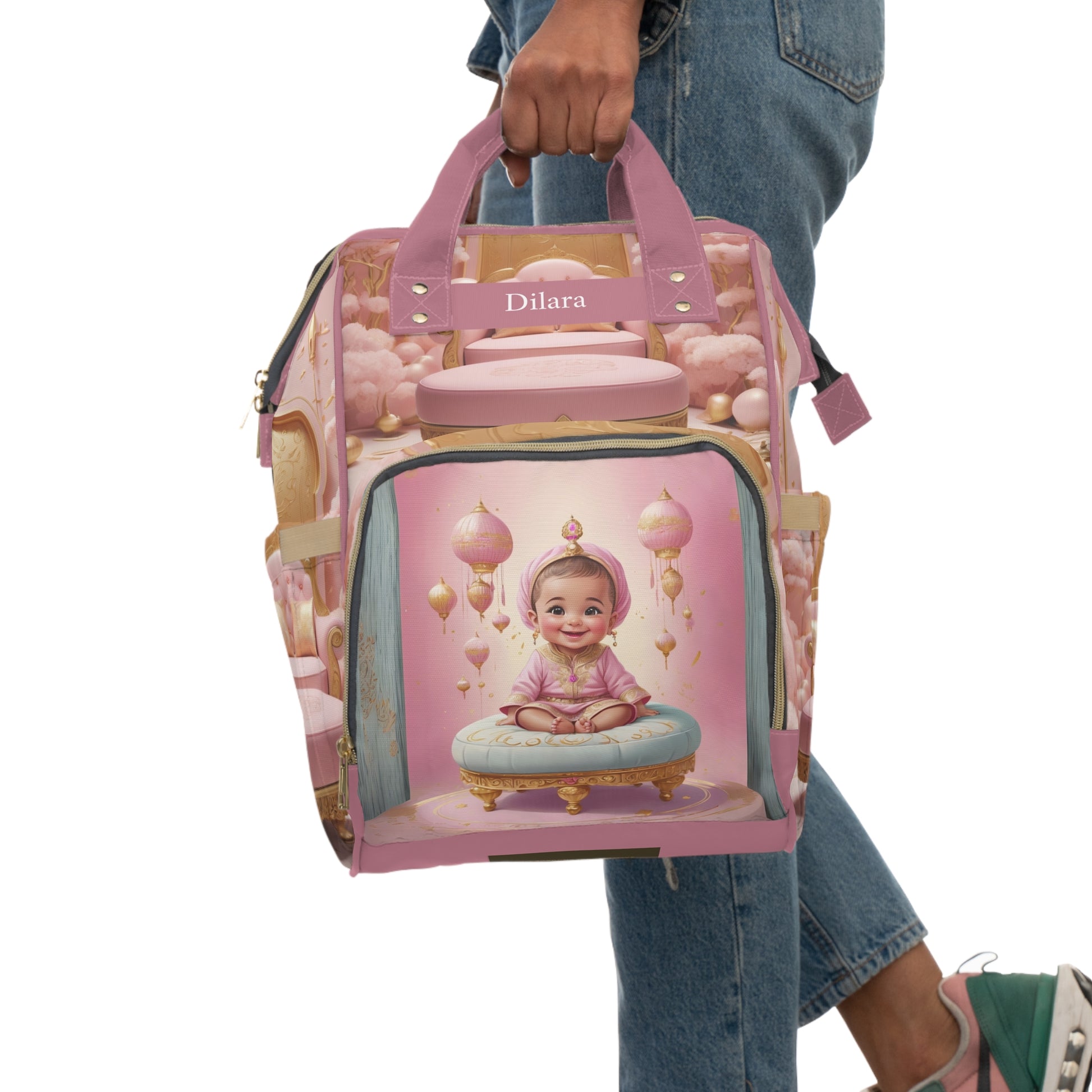 This radiant design features a Turkish baby princess seated gracefully on a royal cushion, surrounded by glowing lanterns and dreamy pink clouds. The name Dilara, meaning "she who delights the heart," perfectly symbolizes happiness, charm, and love. With its pastel pink palette and golden Ottoman-inspired accents, this bag captures the warmth of Turkish heritage while offering a modern, elegant look. More than just a baby bag, it is a keepsake that radiates joy and tradition.