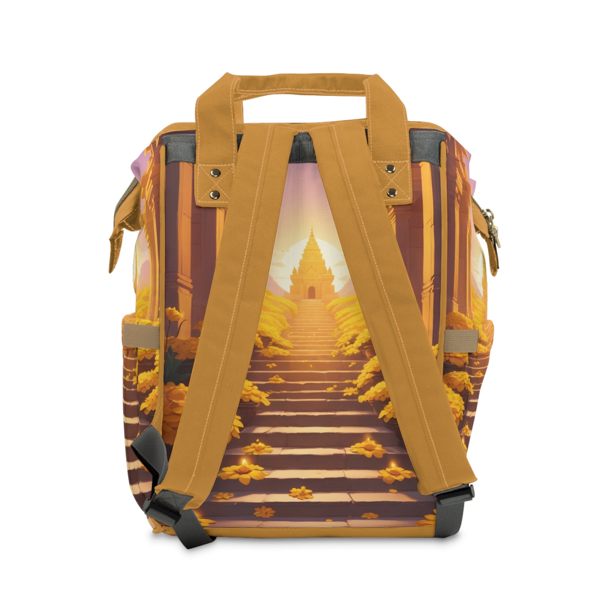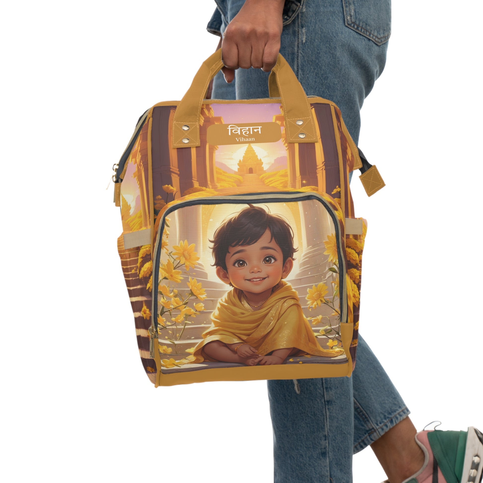 The Vihaan Baby Bag (विहान) captures the beauty of new beginnings and the light of tradition. Vihaan, meaning dawn, is portrayed as a cheerful baby boy wrapped in golden attire, surrounded by radiant yellow blossoms and glowing temple steps bathed in sunrise light. The design celebrates joy, warmth, and the cultural richness of India.